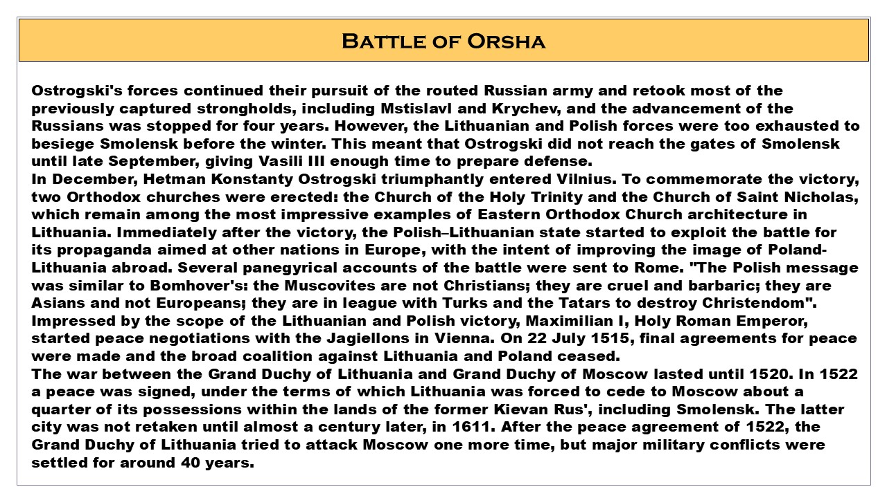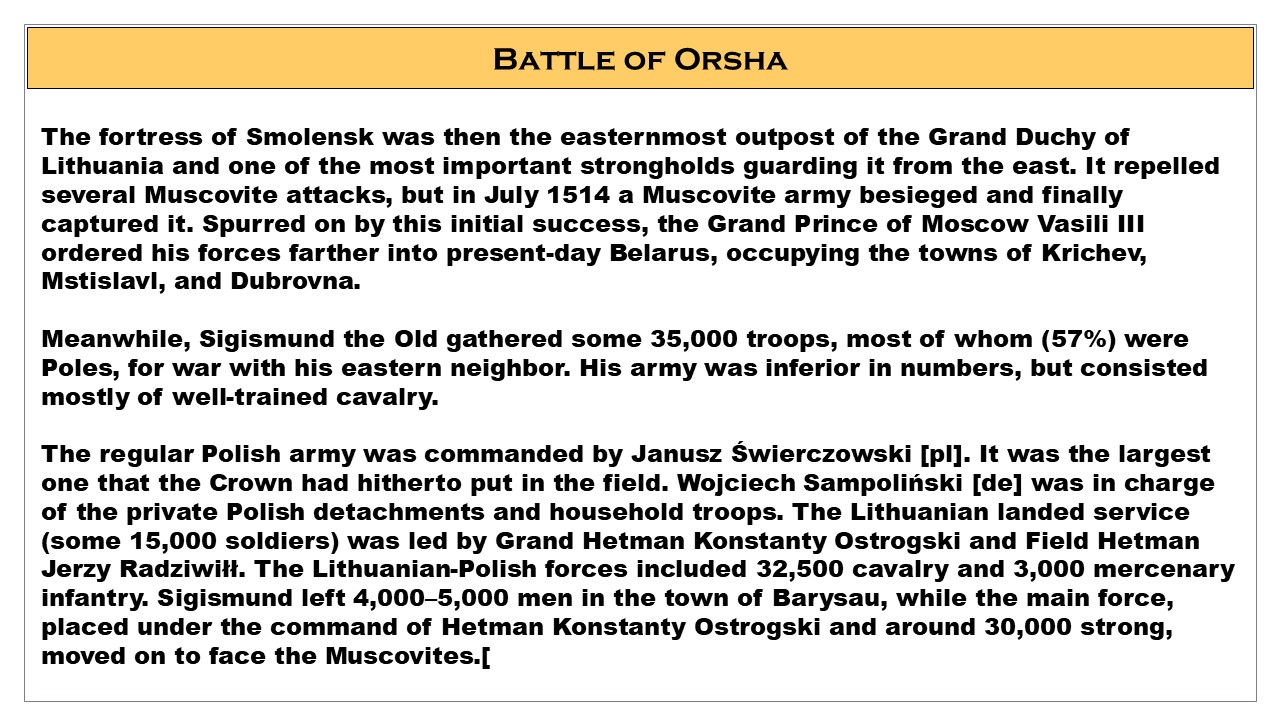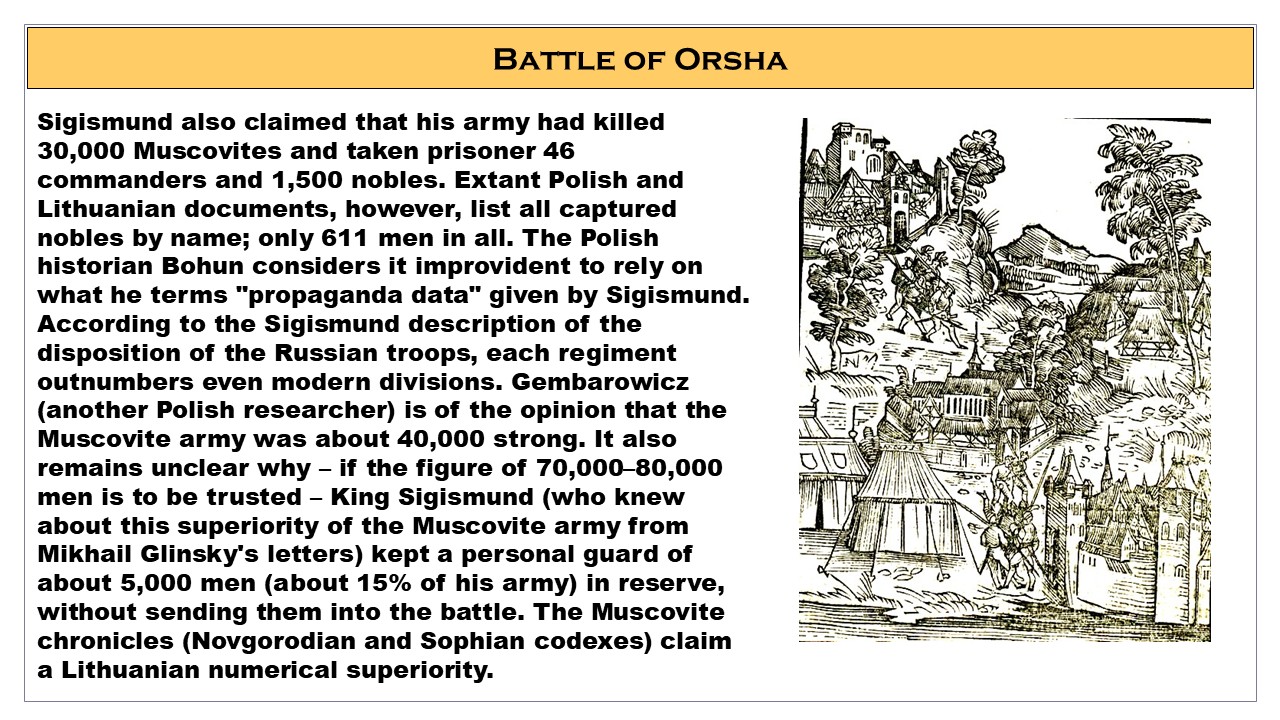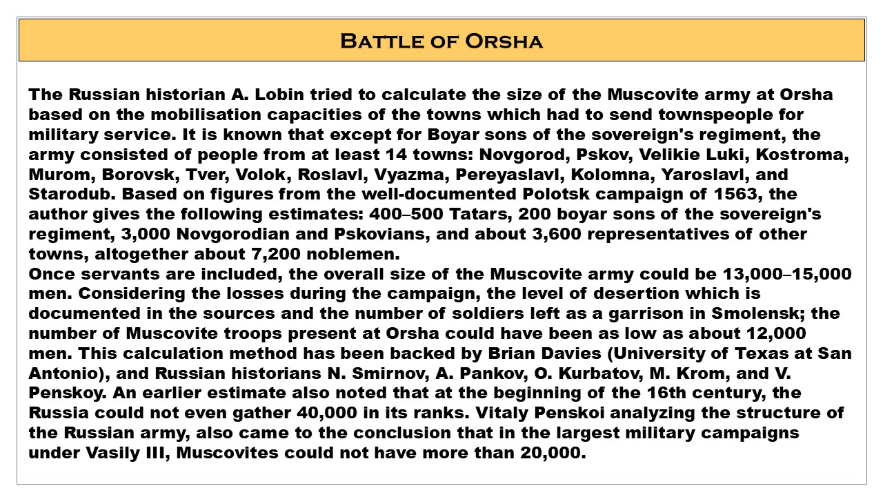 According to Rerum Moscoviticarum Commentarii by Sigismund von Herberstein, the primary source for information on the battle, the much smaller army of Lithuania–Poland (under 30,000 men) defeated a force of 80,000 Muscovite soldiers, capturing their camp and commander. These numbers and proportions have been disputed by some modern historians.