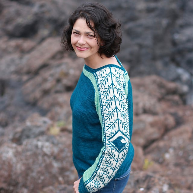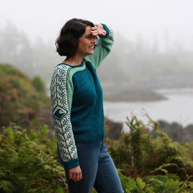 Since learning how to knit, I’ve wanted a colourwork saddle-shouldered pullover. Pinewave was inspired by the Pacific Northwest, with delicate pine branches and a strong crashing wave.