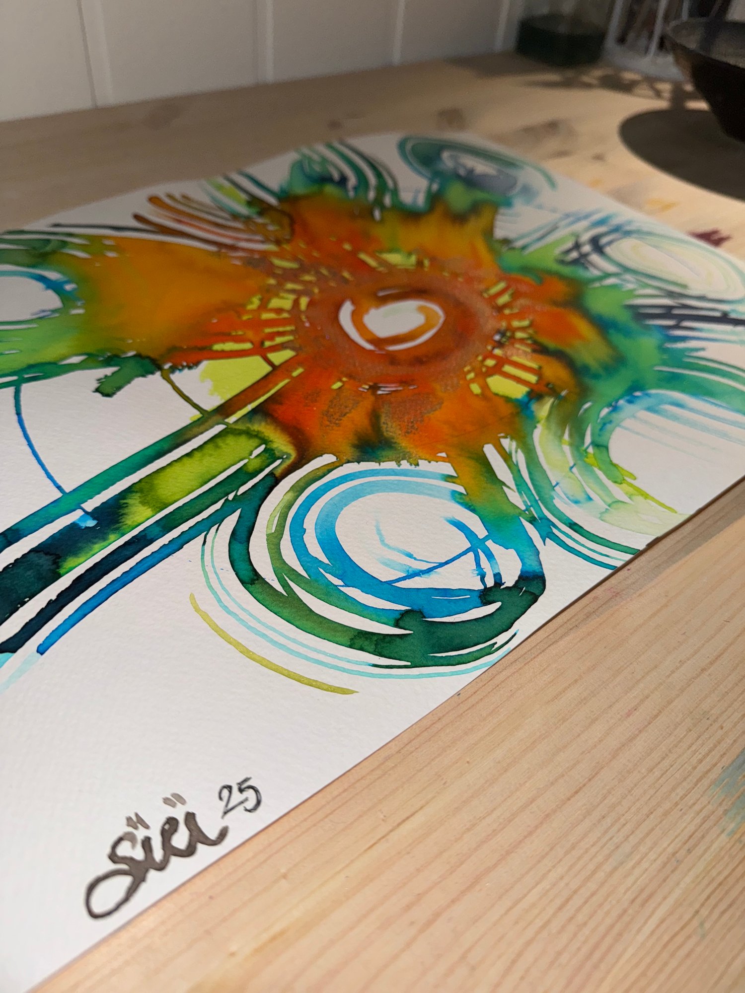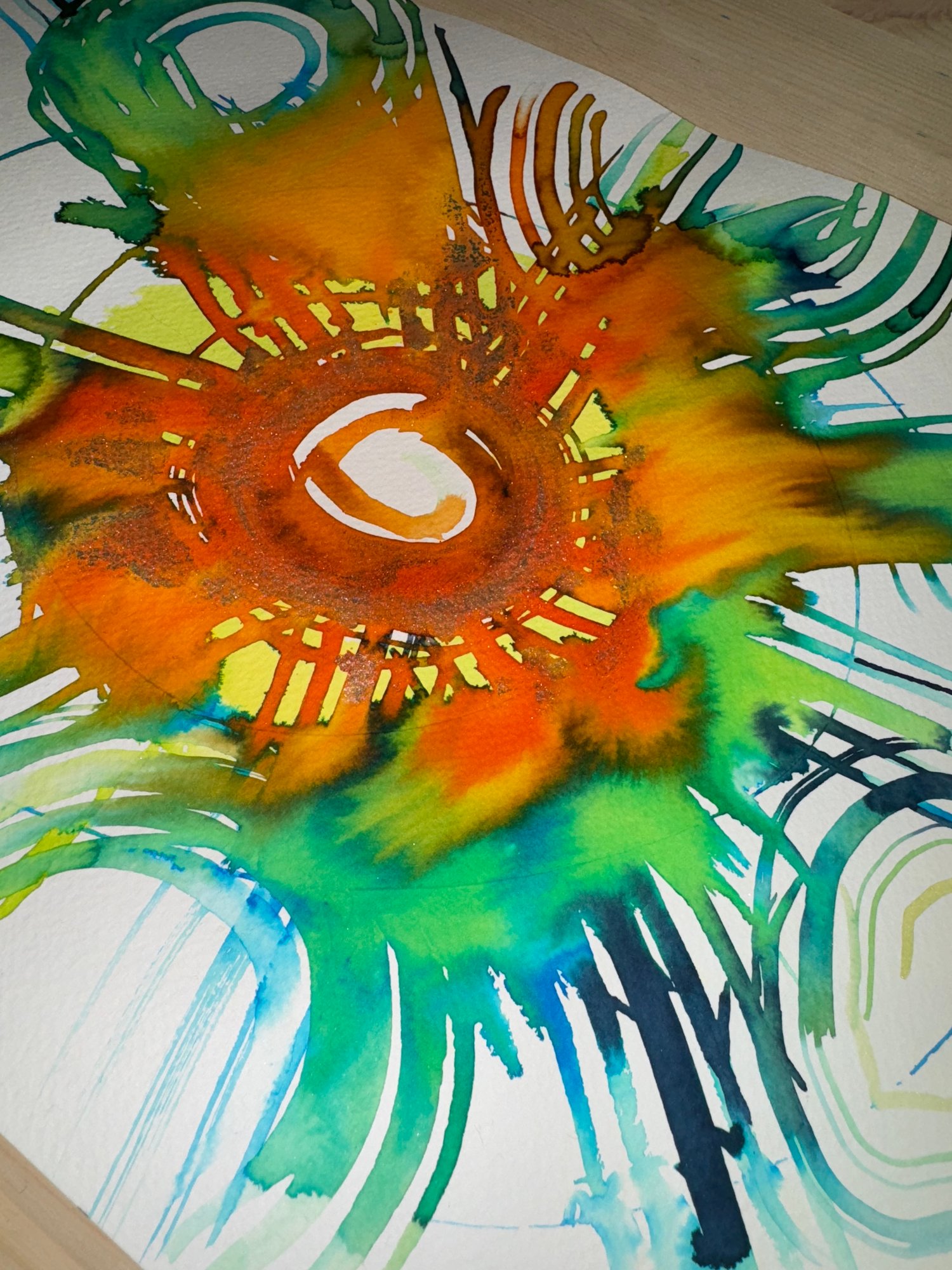 This Soulpiece was born in the vibrant field of a live Insight Timer audience, carrying the shared breath, energy, and joy of everyone present. The colours radiate outward from a sunlit core — gold and orange warmth at the centre, expanding into greens and blues like ripples of laughter. Circular forms echo around the edges, each a pulse of connection sent and received.