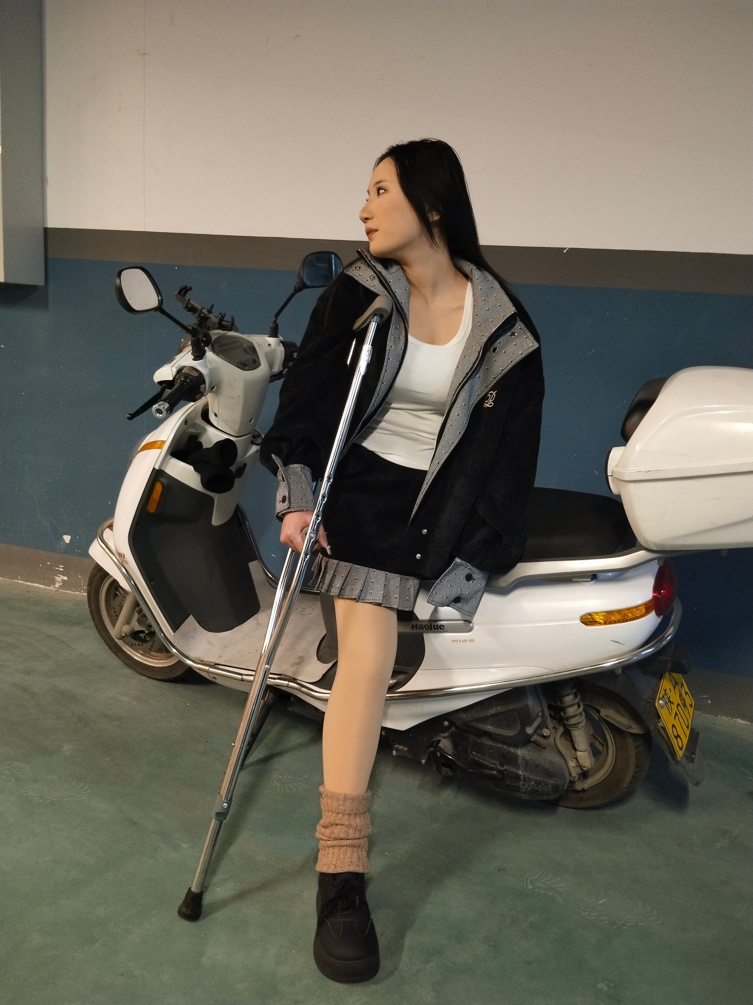 Today, Beibei arrived at a poorly lit underground parking garage, and she felt extremely frightened. Not only was it incredibly dark, but there wasn't a soul in sight. It felt like a scene from a horror movie, making her desperate to escape. However, she only had a crutch and one leg, which made her movements very slow.