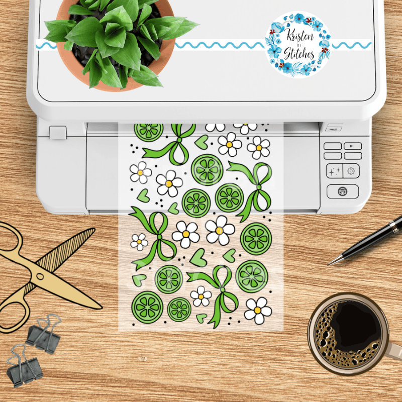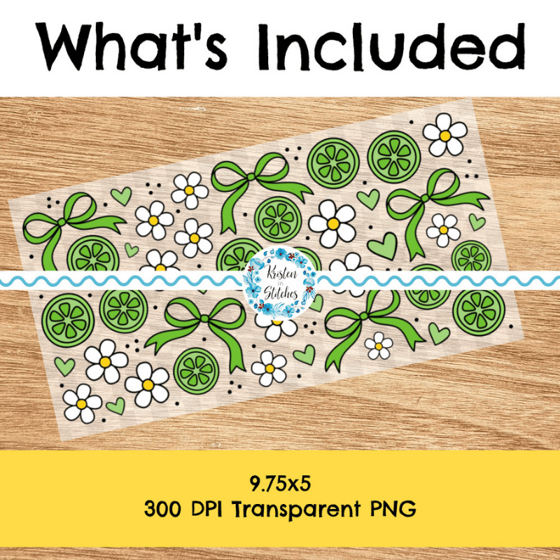Features cute ribbon bows, green limes, hearts and daisy flowers.