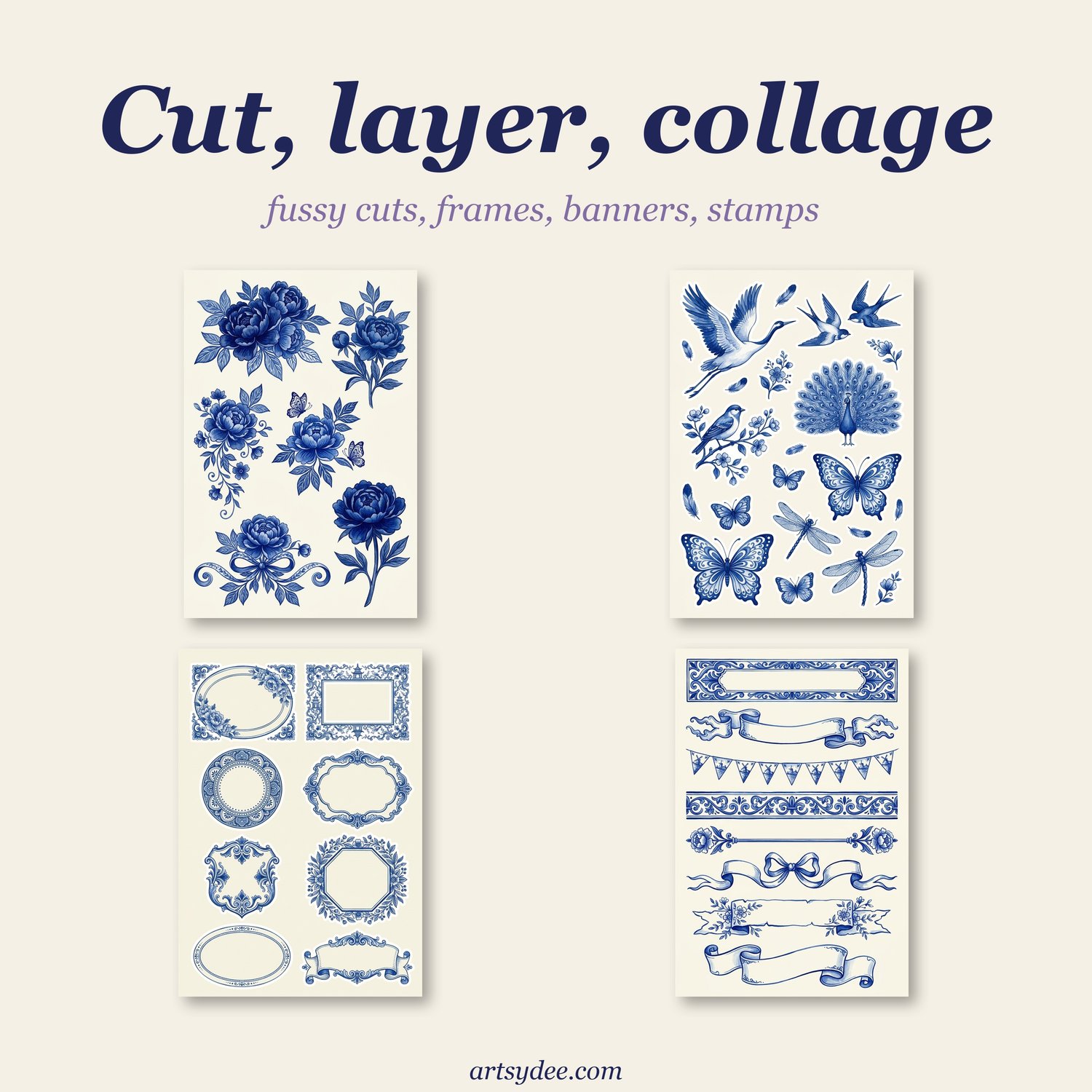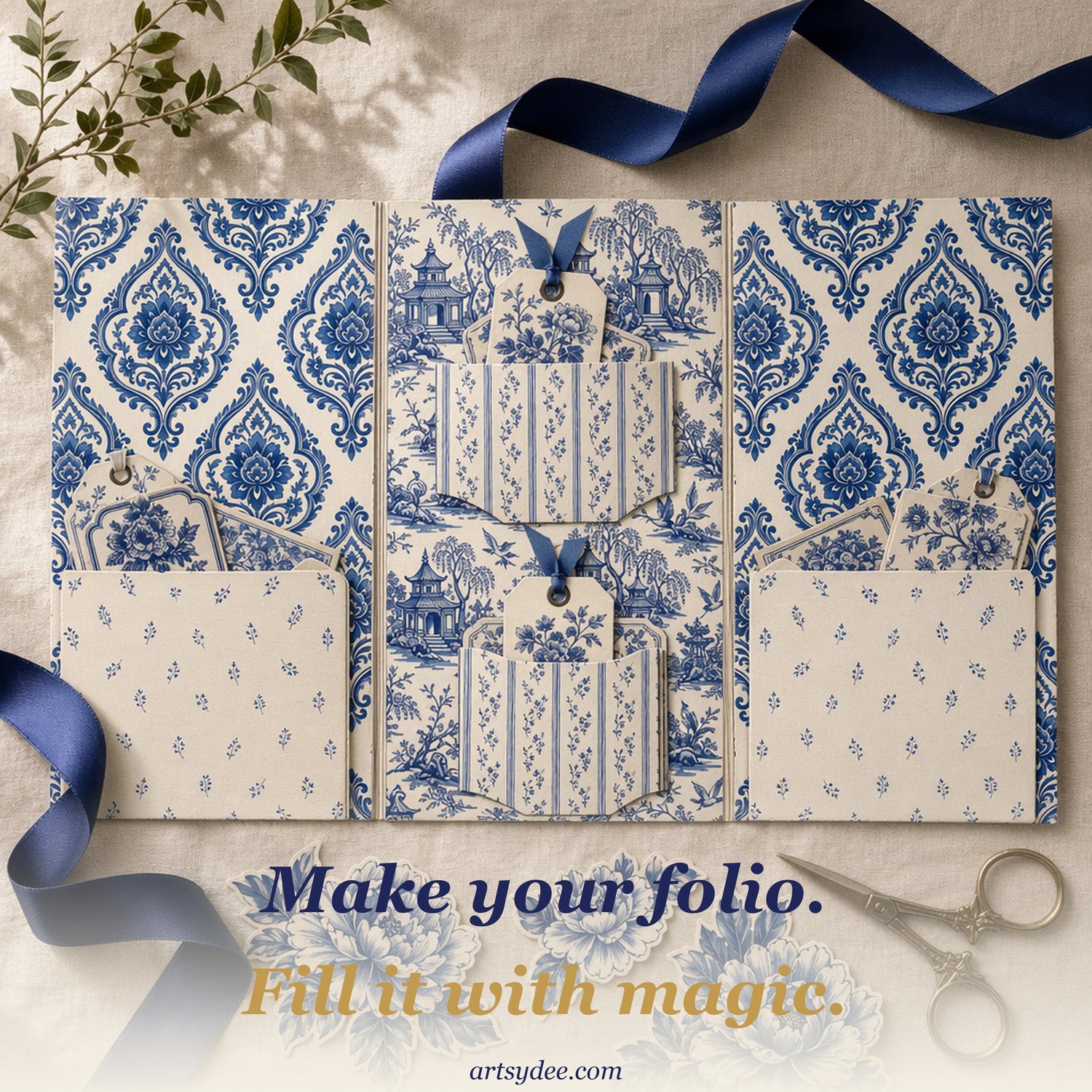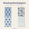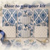 This is Volume 1 of my new folio-style junk journal kit series — a romantic, refined collection of hand-painted Delft blue and warm cream printables, designed to give you maximum creative freedom. There's no prescribed dieline to follow, no measured template to fight with — just gorgeous papers, beautiful ephemera, and a fun visual how-to so you can build your own tri-fold folio (or whatever you dream up) your way.