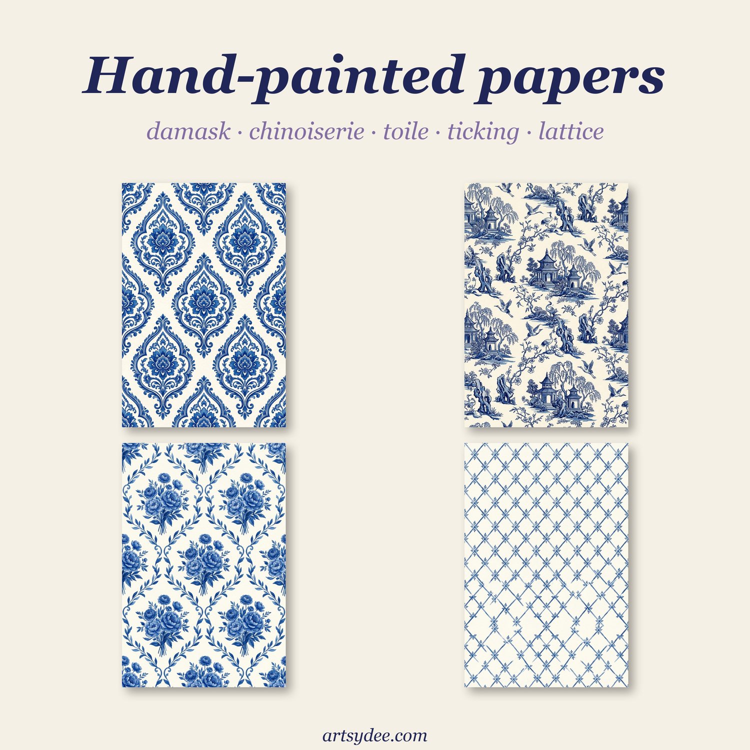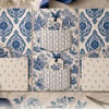 Hand-painted Delft watercolour patterns — damask, chinoiserie toile, ticking stripe, tiny sprigs, diamond lattice, polka sprigs, windowpane plaid, wreath medallions, faint ledger grid, and more. A full mix of background, medium and statement designs so you can layer freely.