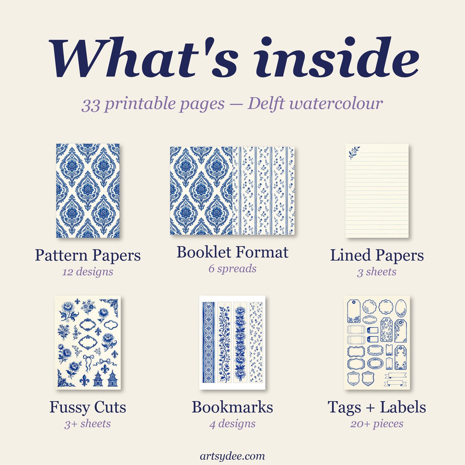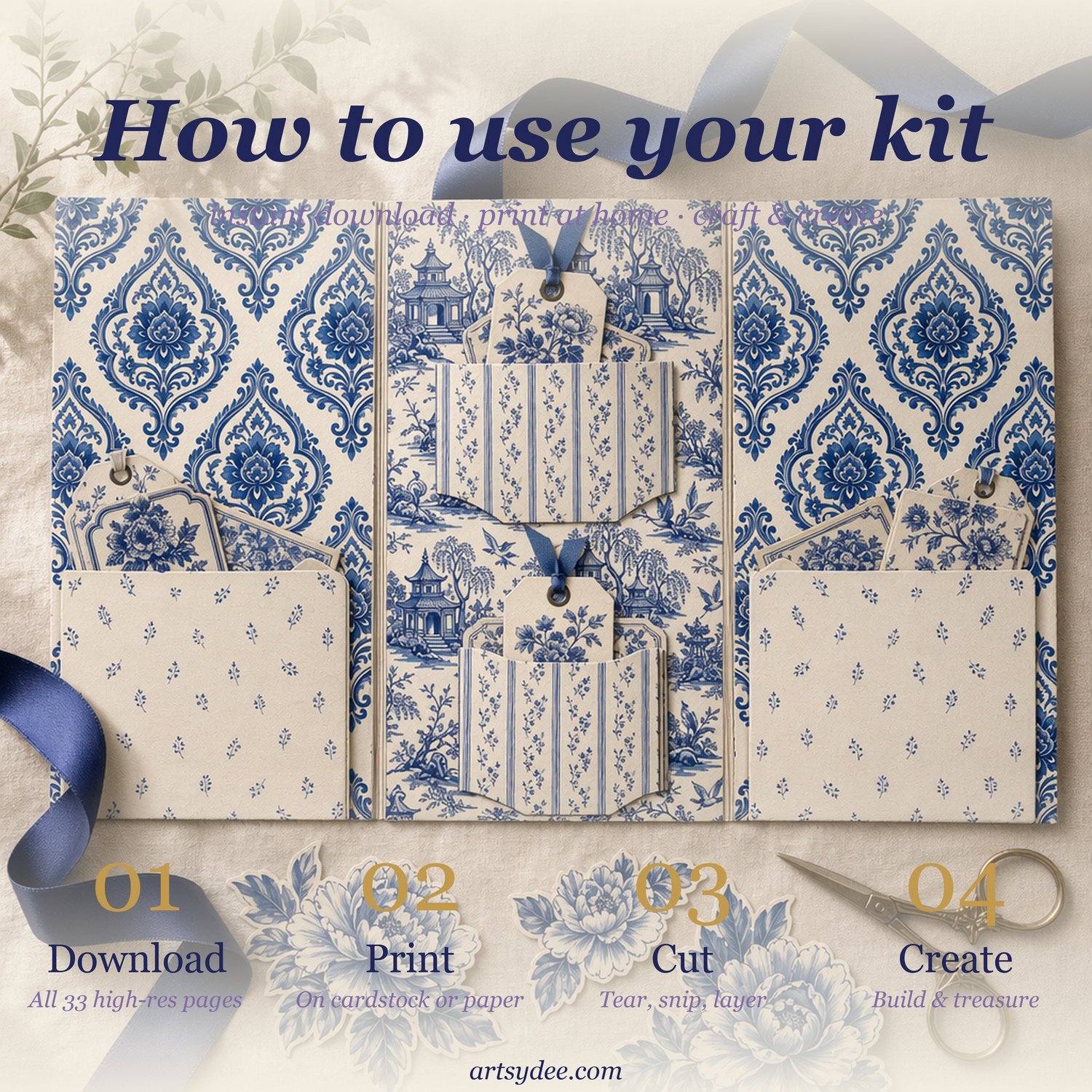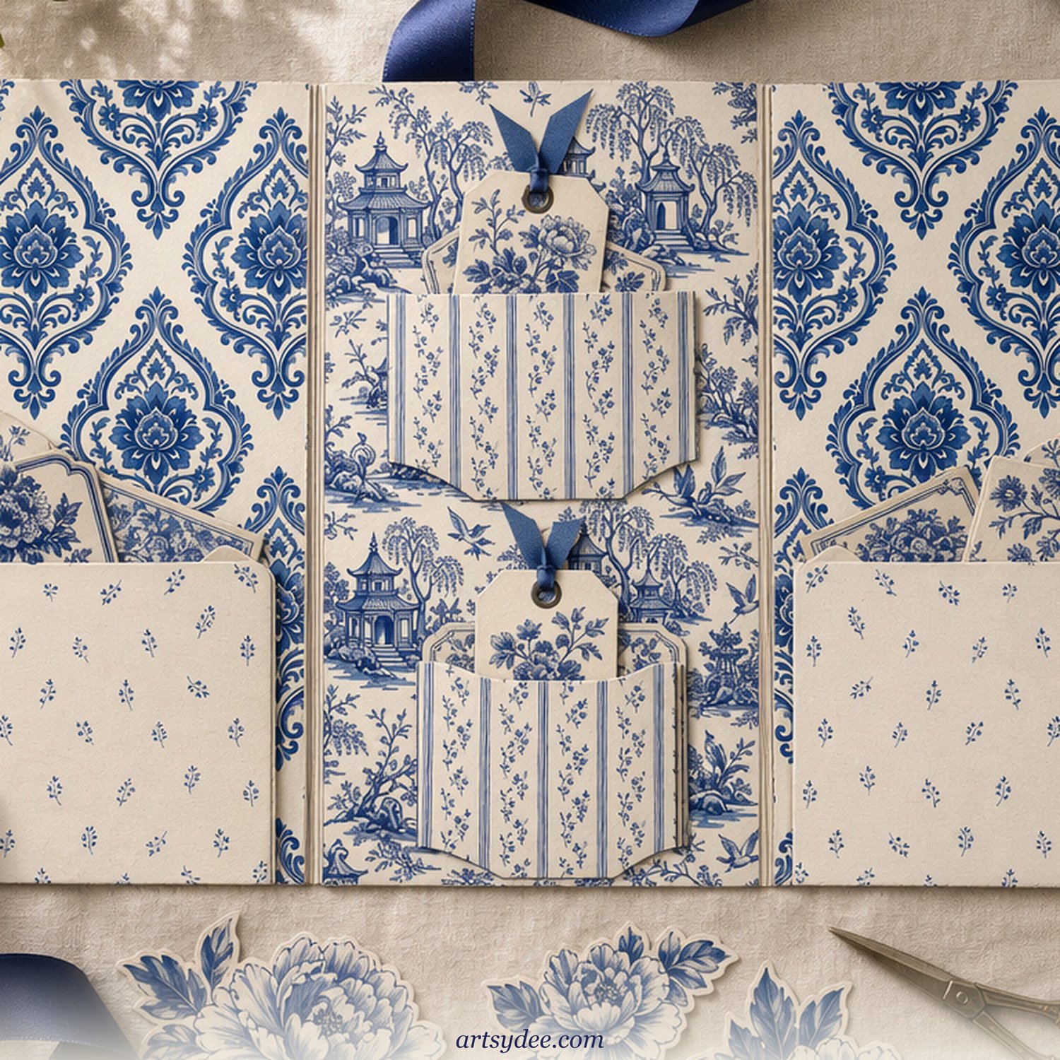 Delft Folio Junk Journal Kit | Blue & White Chinoiserie Printable Pack | 32 Pages of Pattern Papers, Bookmarks, Tags, Fussy Cuts & Ephemera | Instant Download
