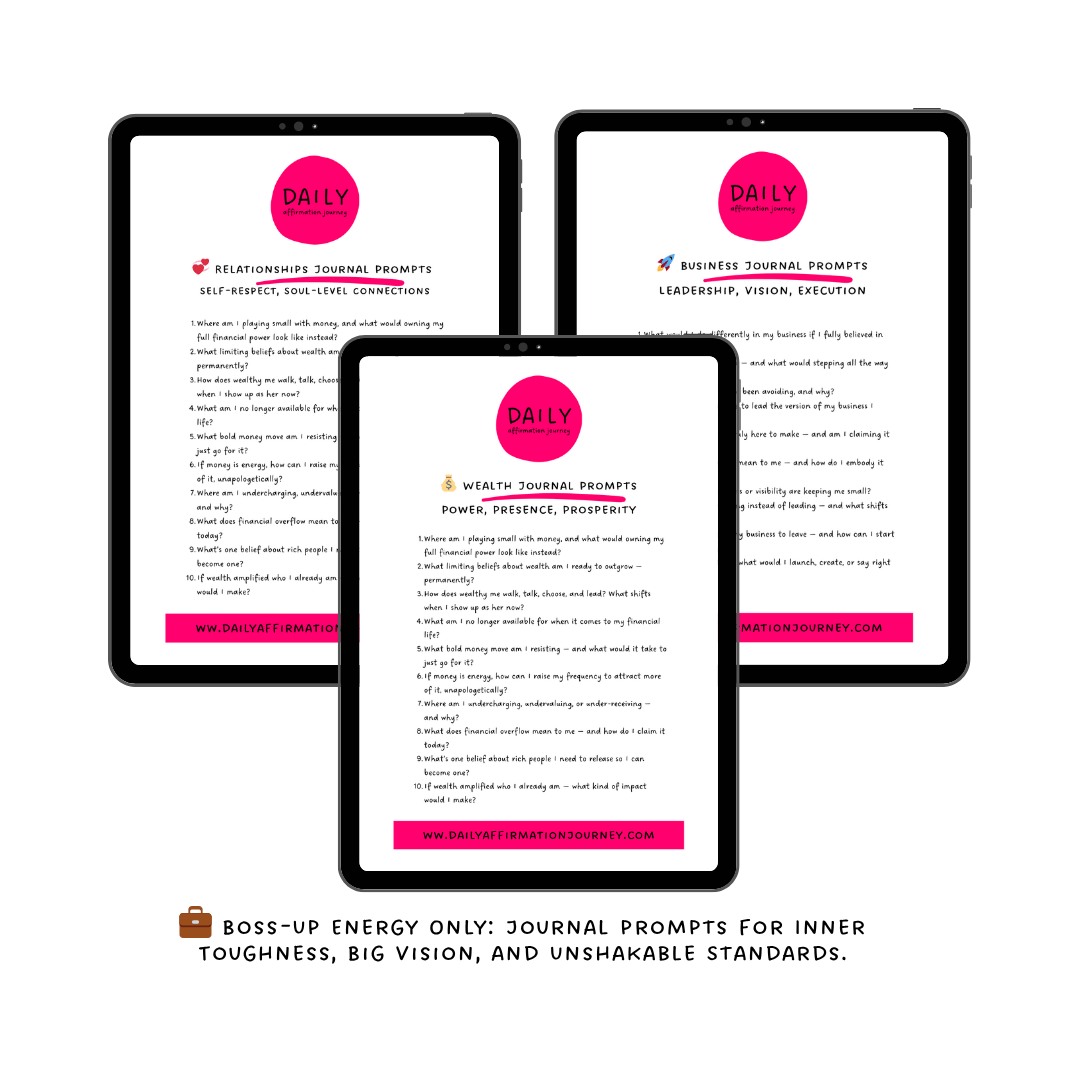 Bold, Boss-up style JOURNAL PROMPTS for each of the three categories: Wealth, Relationships, and Business — all with the vibe and energy of inner toughness, bold self-respect, and unapologetic self-leadership energy.