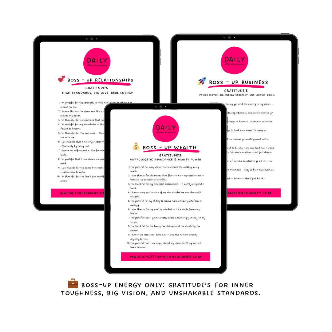 Bold, Boss-up style GRATITUDE'S for each of the three categories: Wealth, Relationships, and Business — all with the vibe and energy of inner toughness, bold self-respect, and unapologetic self-leadership energy.