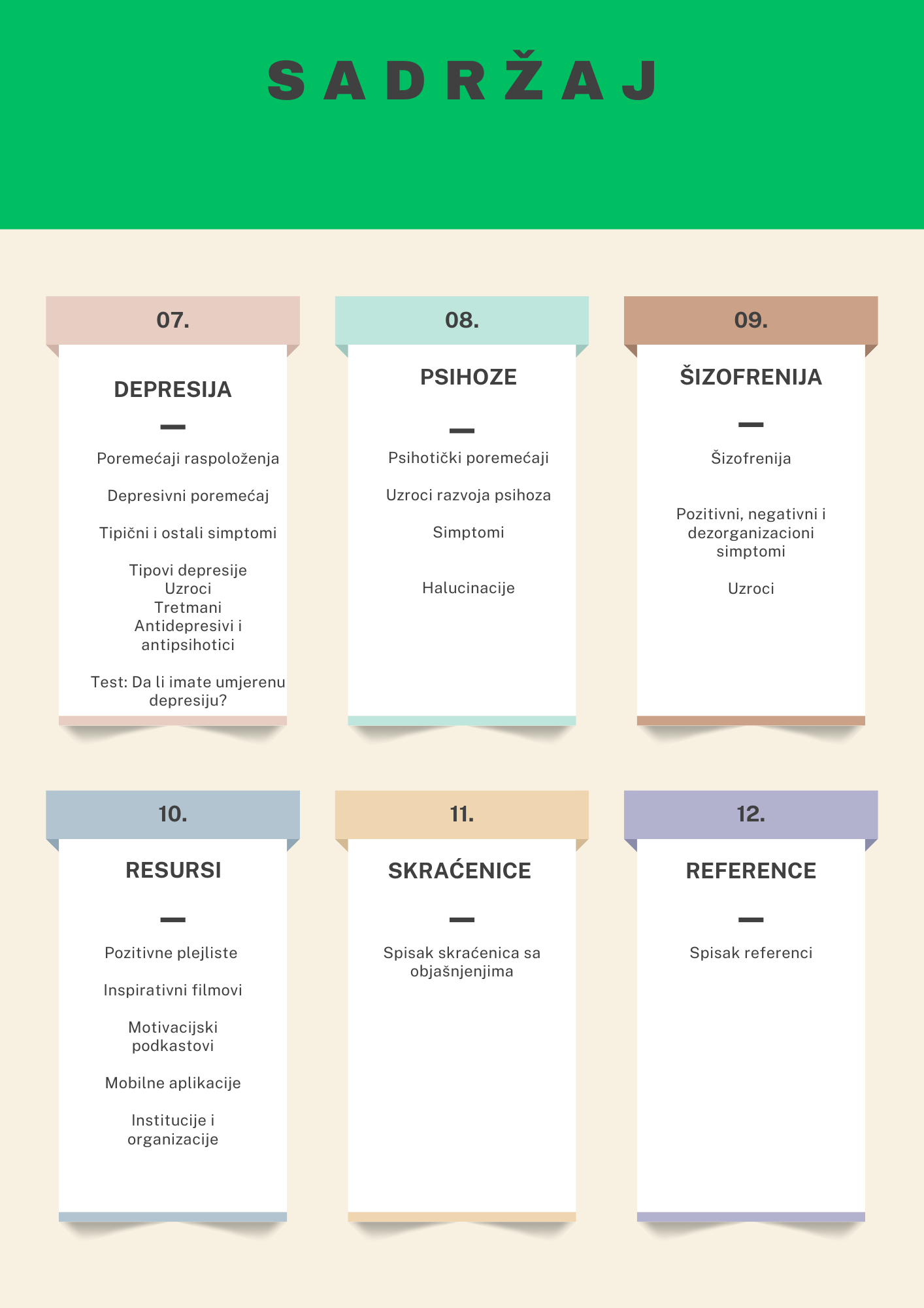 E-knjiga Vodič za mentalno zdravlje i mentalno blagostanje na jednostavan i razumljiv način objašnjava stres i mentalna oboljenja, njihove simptomi, uzroke i liječenje i daje praktične i kreativne strategije, savjete i inspirativne uvide za efikasno upravljanje stresom i anksioznošću, savladavanje izazova i kultivisanje pozitivnog pogleda na život.