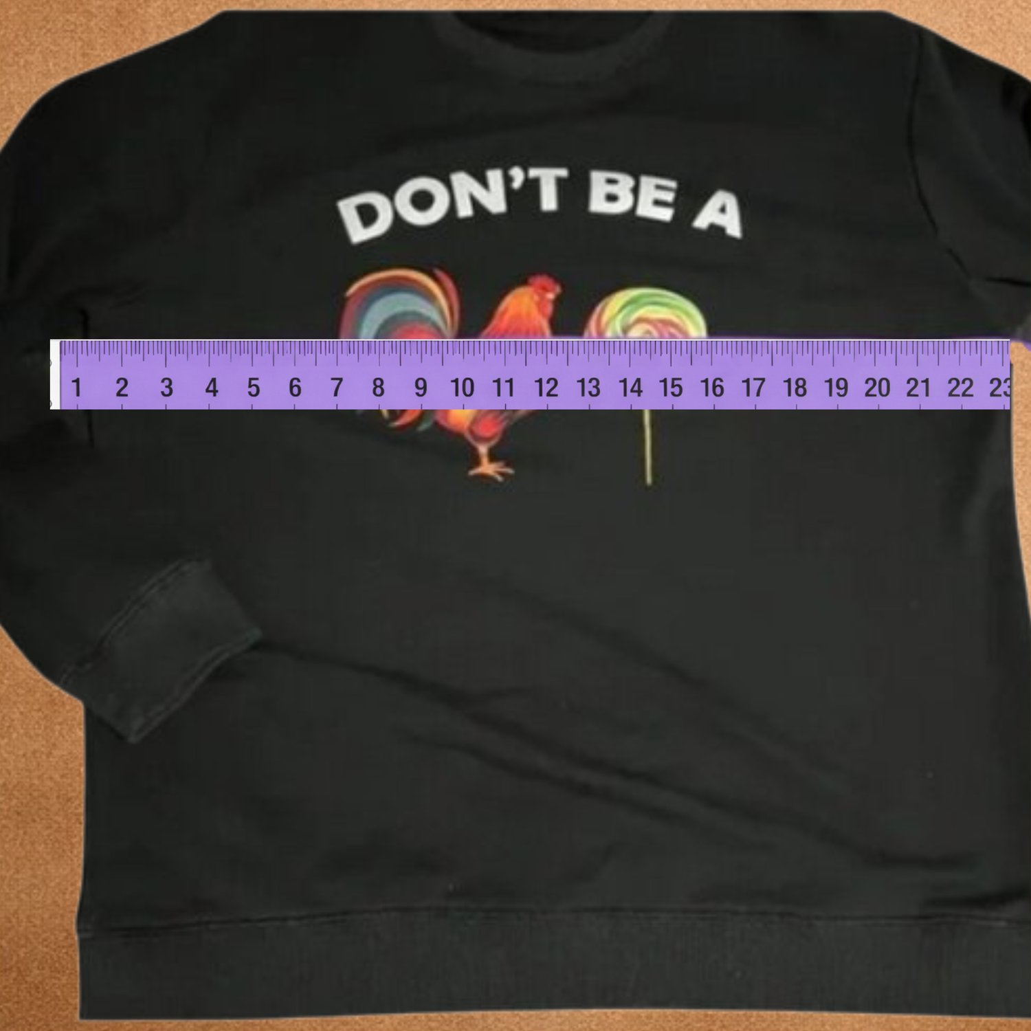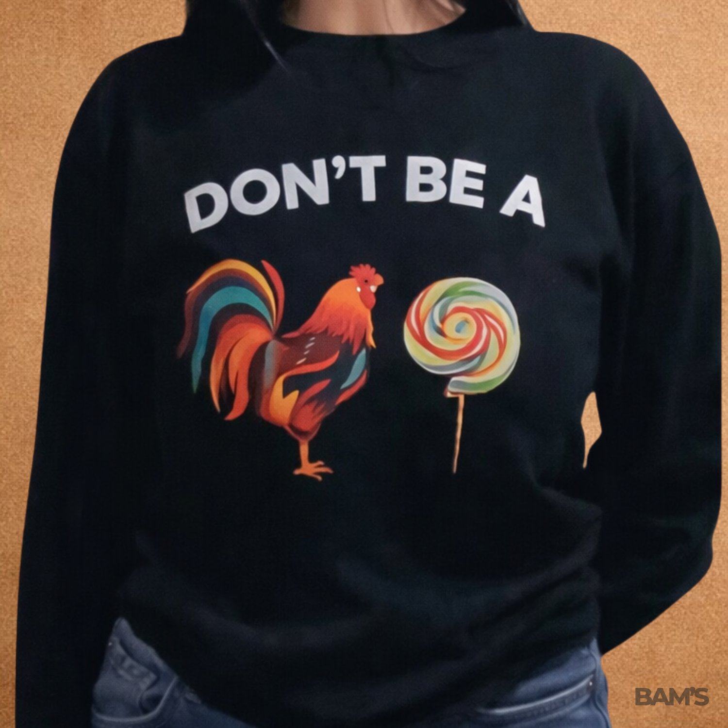 This black graphic sweatshirt features bold white lettering that reads “DON’T BE A” paired with a playful rooster + lollipop graphic for a cheeky, sarcastic vibe. Soft, cozy fabric with a relaxed crewneck fit — perfect for casual days, layering, or making people do a double take.