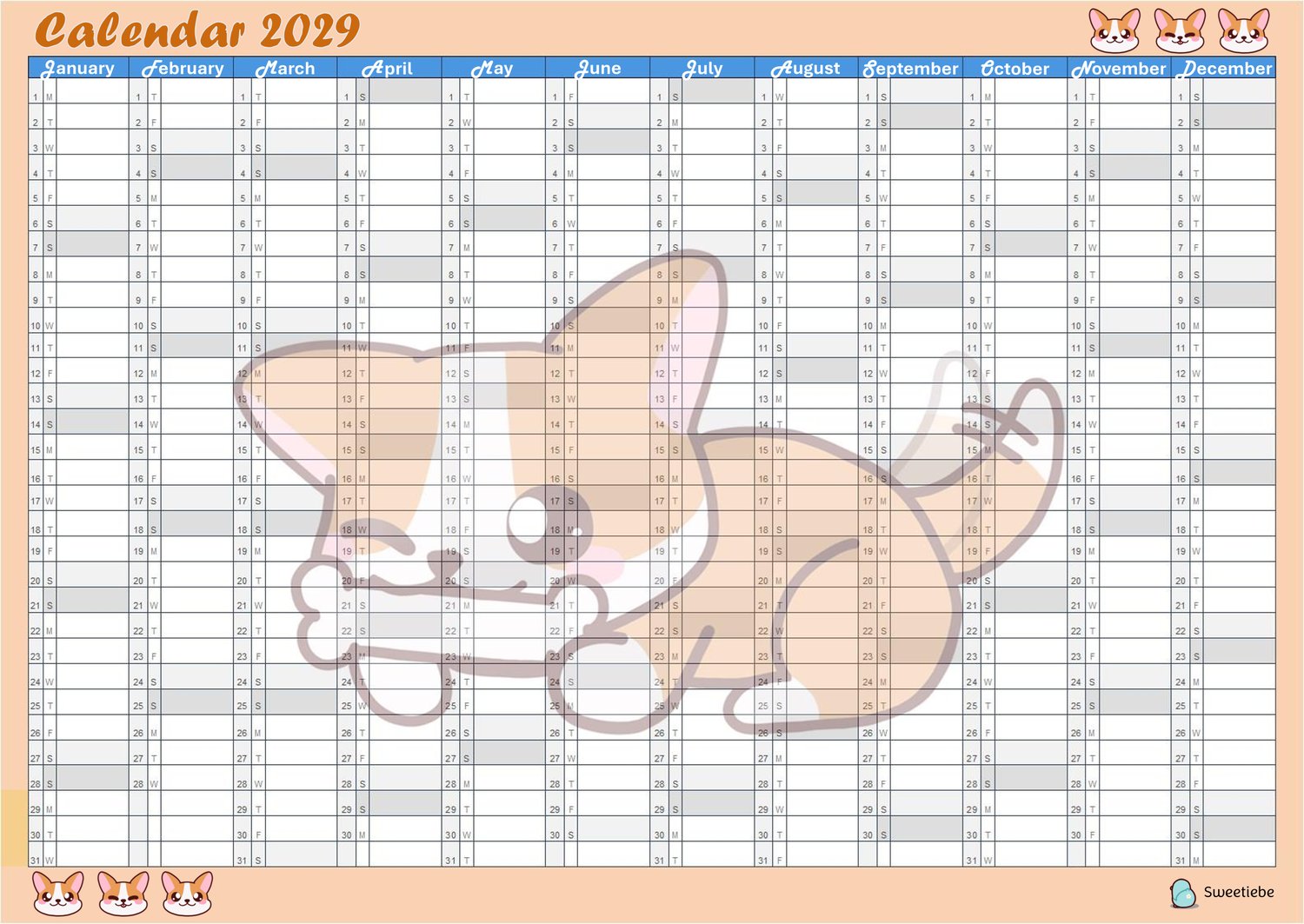 Cute Corgi Design 2029 Single Page Yearly Calendar Planner (Printable & PDF)