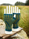 The hats in the pictures took about 375 yards of fingering-weight yarn. The mitts took about 250 yards of fingering-weight yarn. The fancy stitches do take a bit of extra yarn, as does the folded brim on the hat, so you will likely need a bit more yarn than you’re used to. But 400 yards should be a safe bet for any size hat and 300 yards for any size mitt.