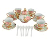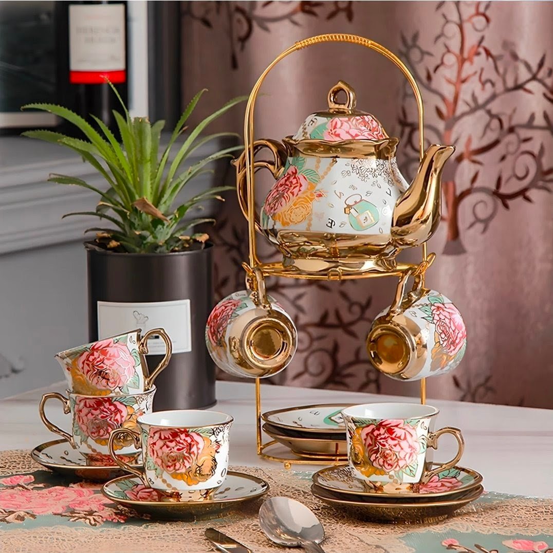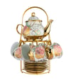 This porcelain tea service features delicate floral detailing, brushed gold accents, and a matching metal stand designed to hold the full set beautifully in one place.