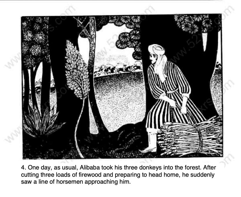 4. One day, as usual, Alibaba took his three donkeys into the forest. After cutting three loads of firewood and preparing to head home, he suddenly saw a line of horsemen approaching him.