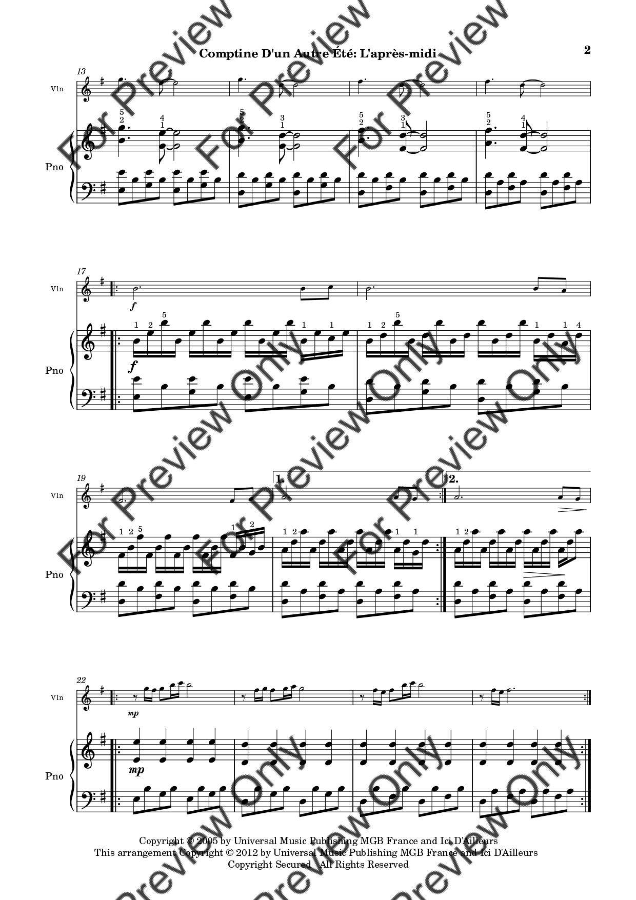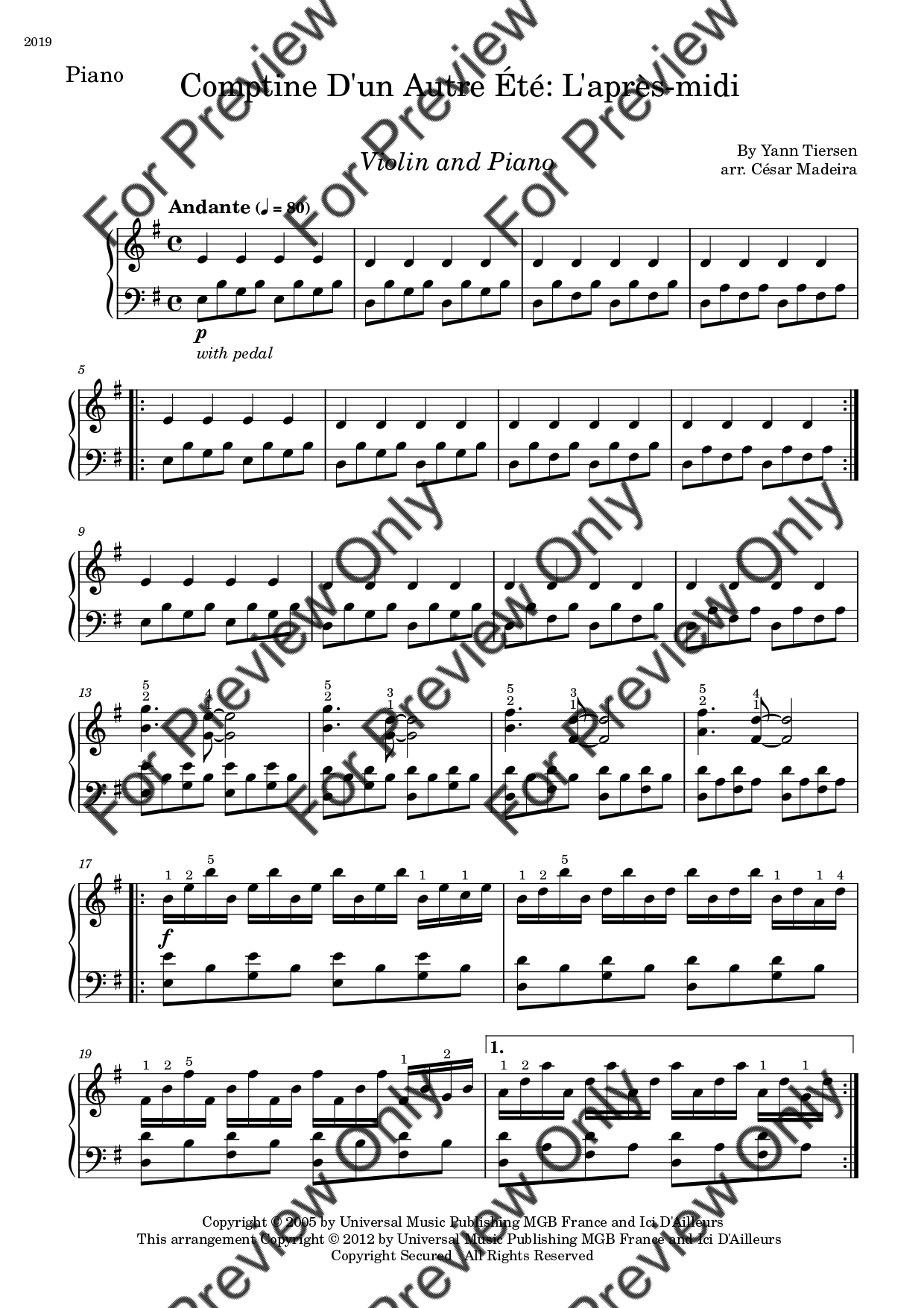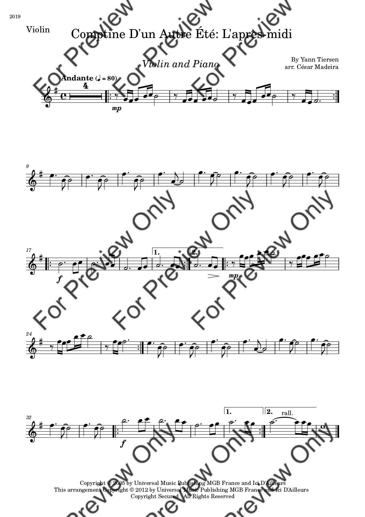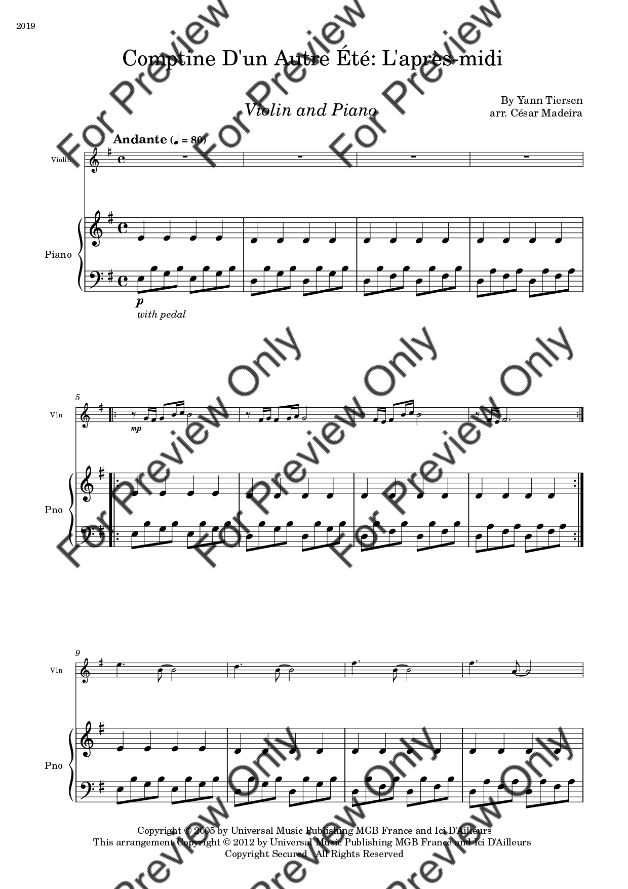 Comptine D'un Autre Été: L'après-midi by Yann Tiersen. Arrangement for Violin and Piano. With Full Score and Individual Parts. Have fun!