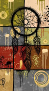 A bold geometric pop-graffiti artwork featuring a large central dreamcatcher outlined in expressive black strokes. The design blends abstract expressionism, pop art, and urban graffiti street art, with vibrant color blocking, textured details, and gold accents. Perfect for scrapbooking, canvas prints, posters, or statement wall art, and so much more.