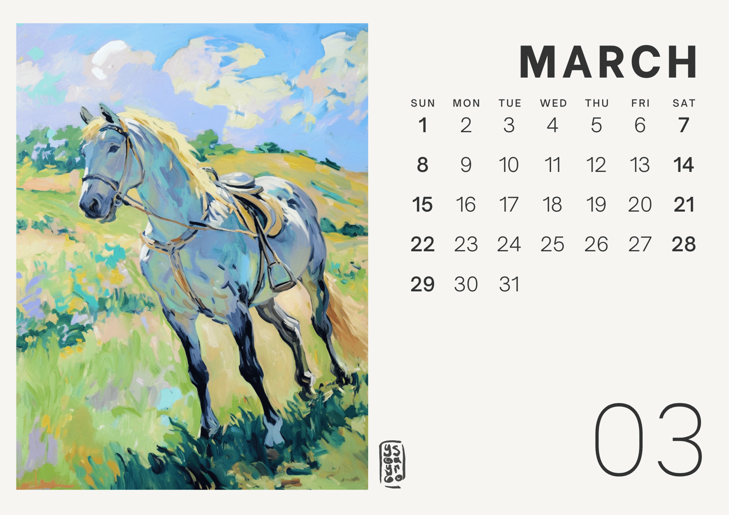 This digital calendar is available in A3 and A4 formats, making it easy to download, print, and hang on your wall. Perfect for horse lovers, art enthusiasts, or anyone looking for a unique and elegant wall calendar.