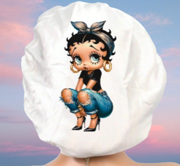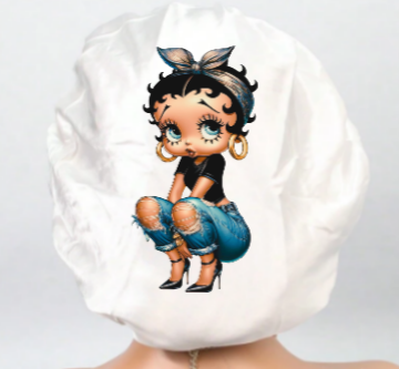 Wrap your crown in confidence with our Women’s Satin Hair Bonnet with a wide band—designed for queens who protect their style and serve looks even in dreamland. Featuring a bold cartoon beauty Betty in ripped jeans, heels, and hoop earrings, this bonnet blends classic sass with modern flair.