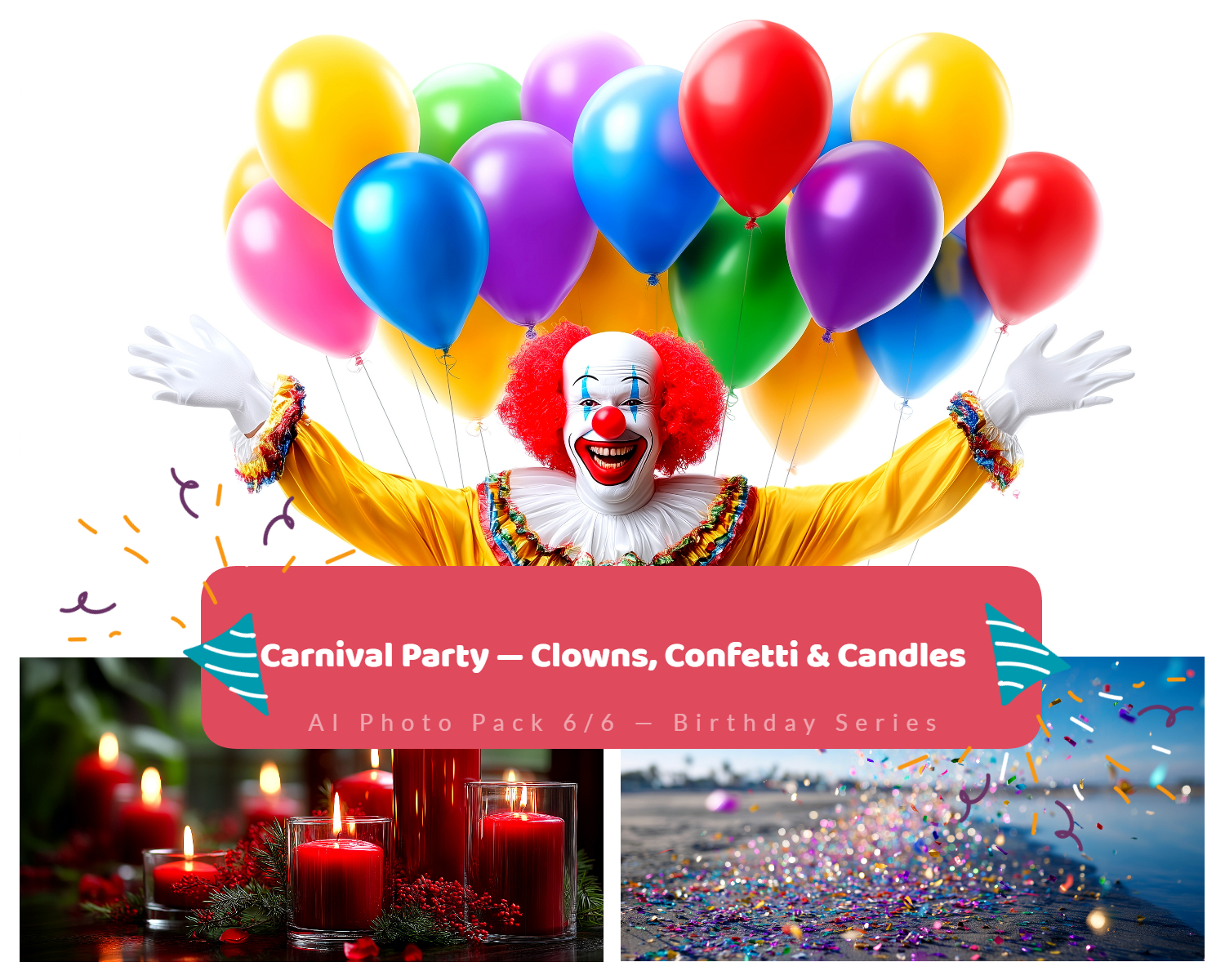 - AI Photo Pack 6/6 — Birthday Series: “Carnival Party — Clowns, Confetti & Candles”