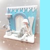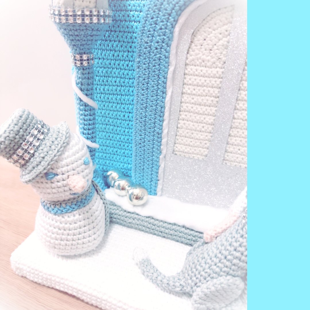 Materials: stuffing, scissors, tapestry needle, glue, glue gun, pencil, ruler, disposable square cotton pads (to be used as snow), 5mm thick cardboard, 1mm thick cardboard, silver rhinestone trim, silver glitter (adhesive) foil/paper, cutting pliers, 2mm aluminum wire, 1 cotton bud, 4pcs of 20mm silver Christmas baubles, 1 sheet of felt (color does not matter), small piece of plastic canvas