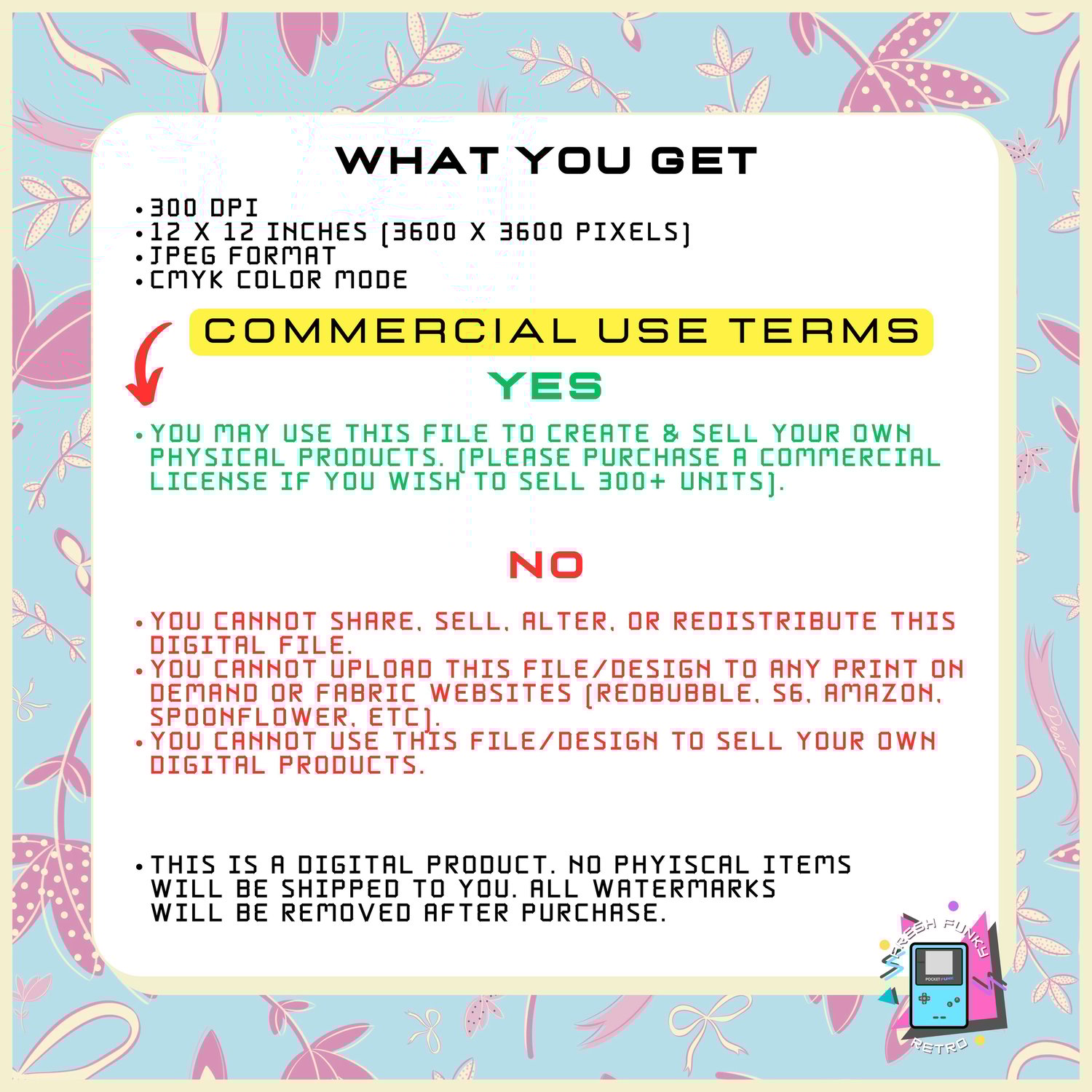 - You cannot upload this file/design to any print on demand or fabric websites (Redbubble, S6, Amazon, Spoonflower, etc).
