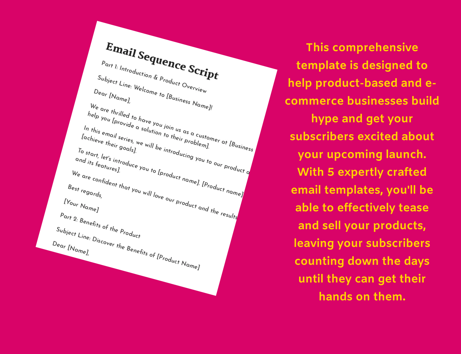 This comprehensive template is designed to help product-based and e-commerce businesses build hype and get your subscribers excited about your upcoming launch. With 5 expertly crafted email templates, you'll be able to effectively tease and sell your products, leaving your subscribers counting down the days until they can get their hands on them.