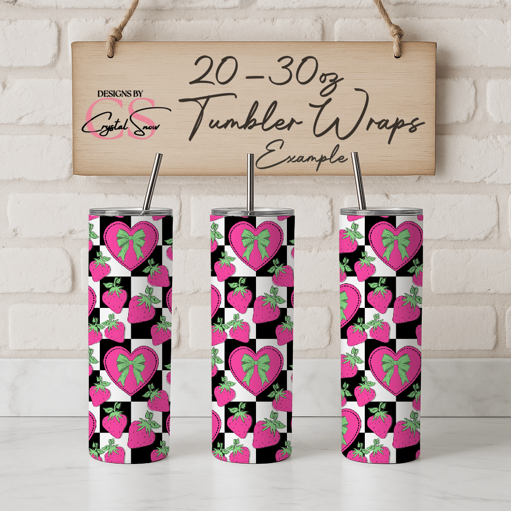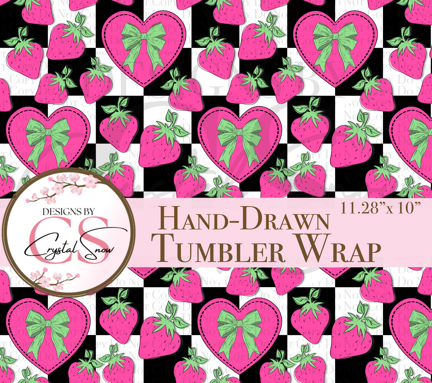 The Checkered Berry Love tumbler wrap features hand-drawn pink strawberries and heart bow details layered over a classic black-and-white checkerboard background. Designed with Valentine vibes but bold enough to use year-round, this wrap is perfect for sublimation tumblers that need personality.