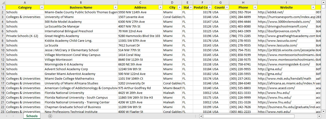 Completa Base de datos de 1600 Colegios de Miami, Florida, Estados Unidos de Norteamérica, organizada en formato Microsoft Excel, con todos los datos de contacto.
