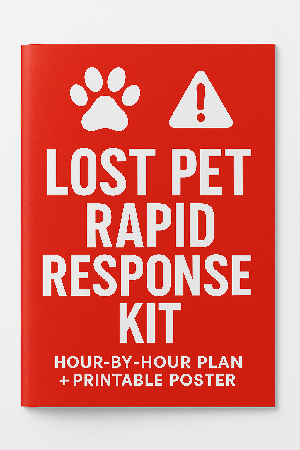 Losing a pet is terrifying. That’s why we created the Lost Pet Rapid Response Kit – a ready-to-print emergency pack that guides you step by step in the first 24 hours.