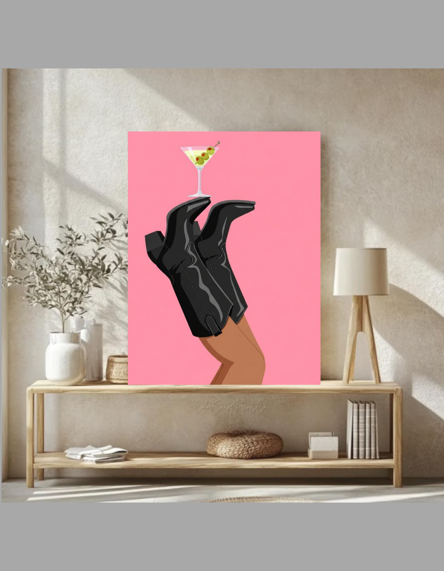 Elevate your space with this whimsical Coastal Cowgirl Boots and Martini Wall Art Printable PNG Digital Download, perfect for adding a touch of cottagecore aesthetic and western charm to your home decor. This high-resolution 300 DPI PNG file features an adorable illustration of cowgirl boots playfully balancing a martini glass, blending coastal cowgirl vibes with girly boho elements for that trendy dopamine decor boost.