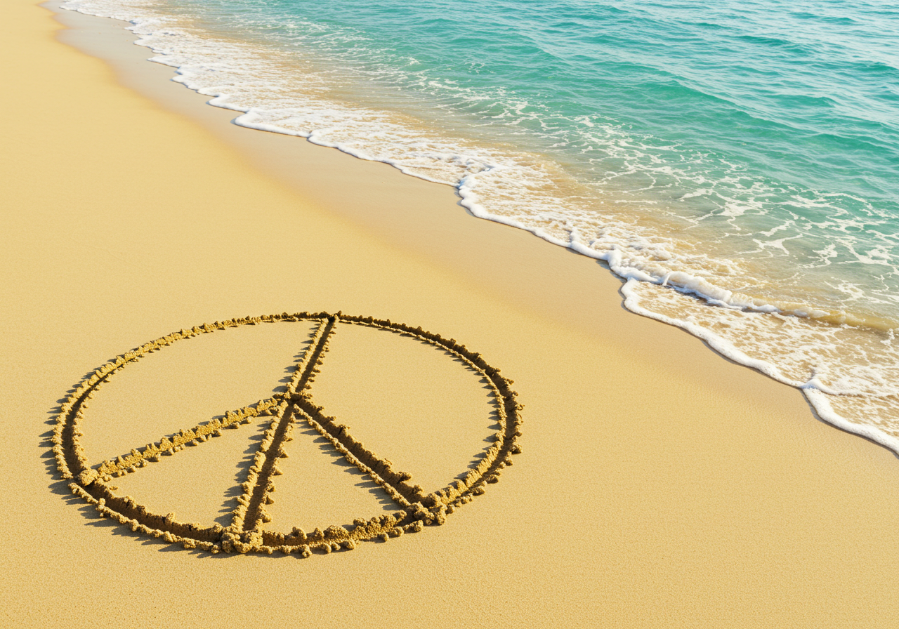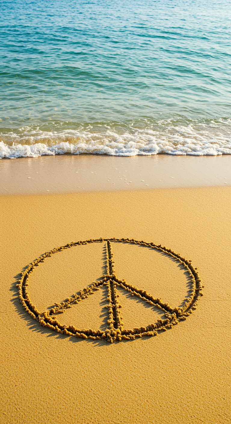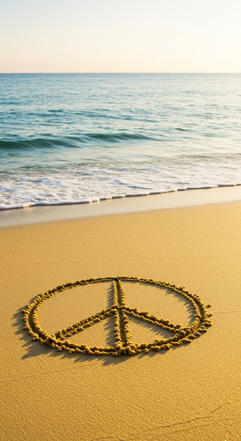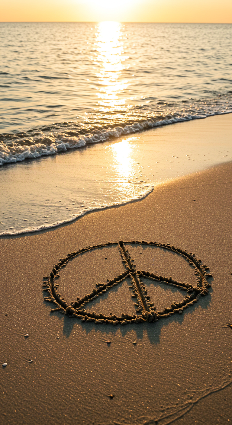 A photograph capturing a peace sign drawn in the soft, wet sand of a beach. The image is set against the backdrop of a vibrant sunset, with warm hues of orange, pink, and purple reflecting on the water and the wet sand. The gentle waves of the ocean can be seen lapping at the shore, creating a tranquil and serene atmosphere. This image embodies a feeling of peace and calm, making it a perfect piece for anyone looking to bring a sense of tranquility and natural beauty into their space.