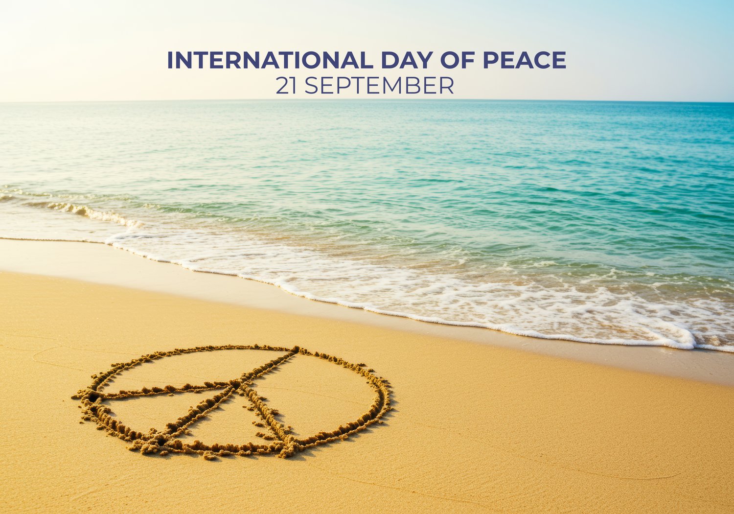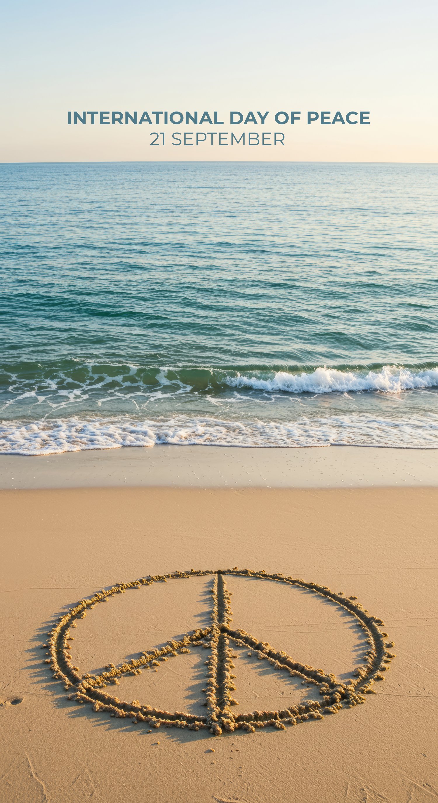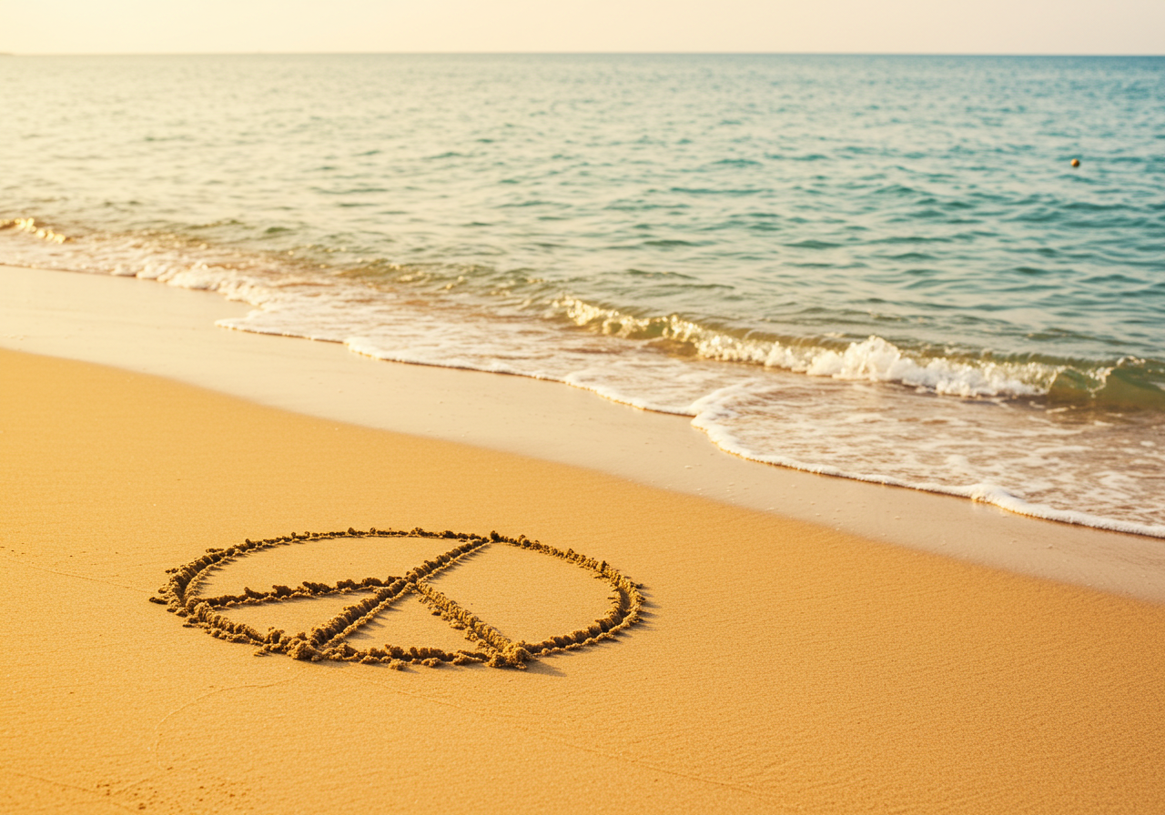 A photograph capturing a peace sign drawn in the soft, wet sand of a beach. The image is set against the backdrop of a vibrant sunset, with warm hues of orange, pink, and purple reflecting on the water and the wet sand. The gentle waves of the ocean can be seen lapping at the shore, creating a tranquil and serene atmosphere. This image embodies a feeling of peace and calm, making it a perfect piece for anyone looking to bring a sense of tranquility and natural beauty into their space.