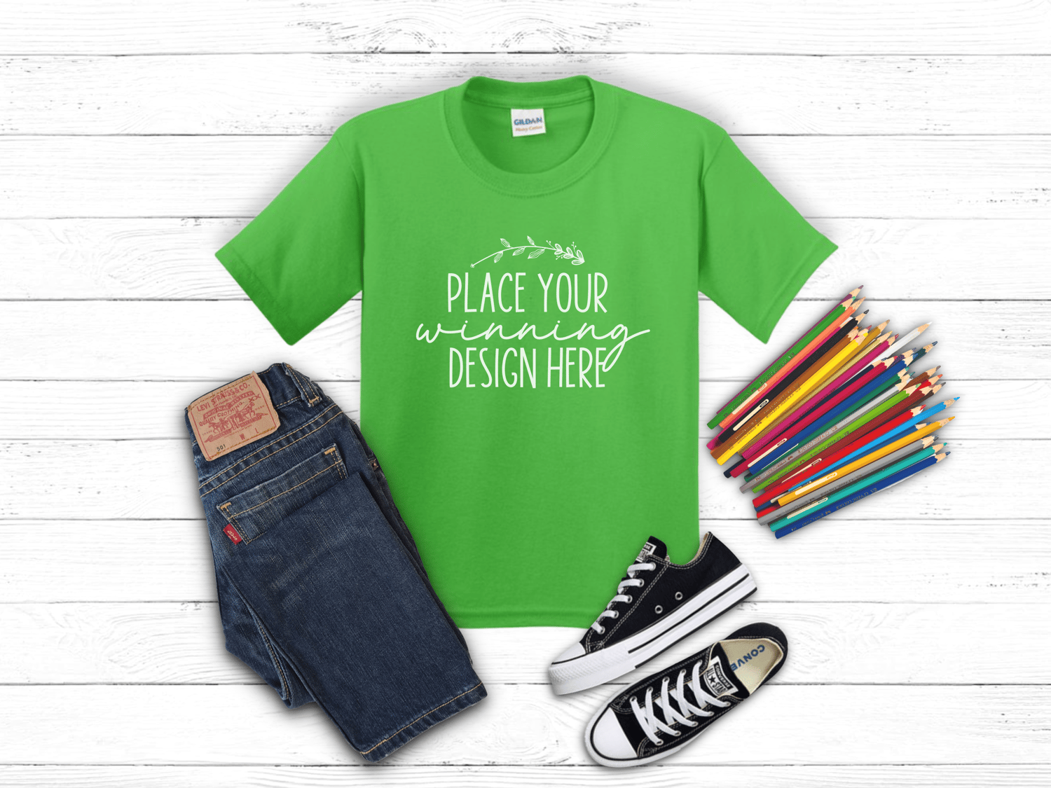 electric green kids shirt mockup Gildan 5000b flat lay gildan green kids t-shirt mockups G500B tshirt mockup children's mock-up jpg download