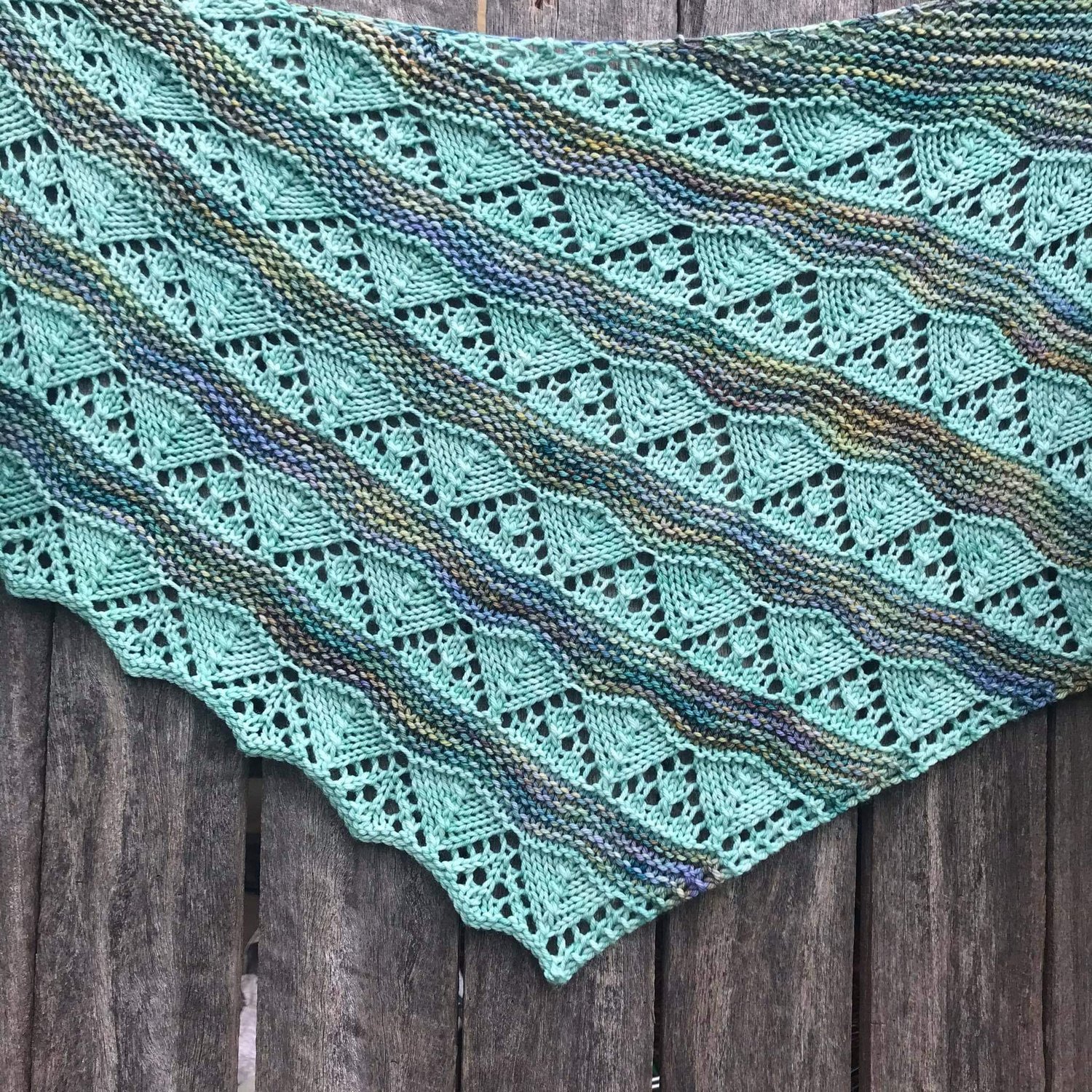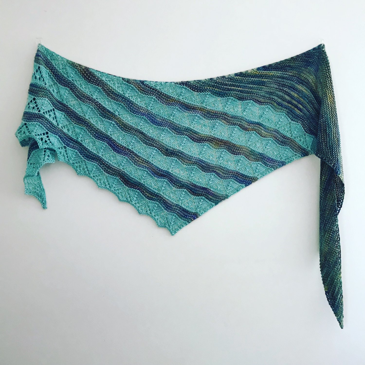 The Water Wish shawl is a garter stitch asymmetrical triangle shape with panels of simple lace arranged in 3 styling options. It is designed for Worsted and DK weight yarns with easy customisation to different yarn weights. This design was created during the Whackalong MKAL 2019 aimed at encouraging the use of handspun yarns and is also great for using mini skeins, stash-busting, and using up any leftovers from other projects. I do recommend a solid colour for the lace panels but all other colour styles and spin styles are suitable for the main body of the shawl, so get creative!