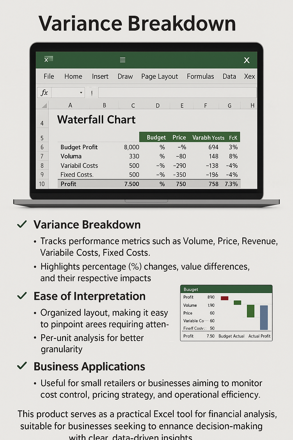 This product serves as a practical Excel tool for financial analysis, suitable for businesses seeking to enhance decision-making with clear, data-driven insights