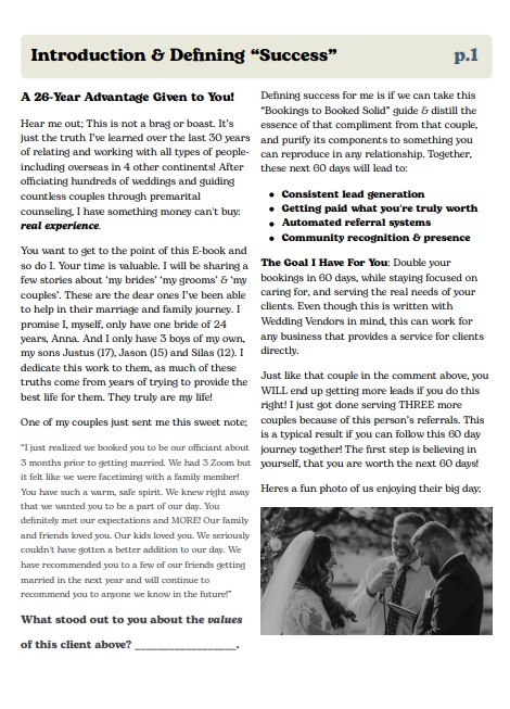 In "From Bookings to Booked Solid: Your 60-Day Growth Blueprint," I lay out my own 26 years of hard-fought truths- my exact strategies that helped us go from unpredictable income to quality relationships with consistent clients who book and pay months in advance. I don't do theories or generic advice—these are battle-tested methods for any service-based business owner ready to stop being just another option.