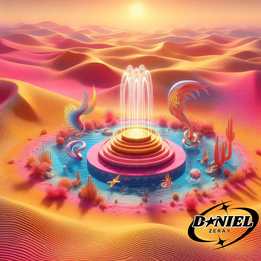 Imagine being in a beautiful desert oasis, where the colorful dunes shift between shades of pink, orange, and gold, shining under a dreamy sky. In the middle, there's a magical fountain that sends sparkling water into a clear pool. This amazing place is filled with unique creatures that are a mix of birds and fish, gliding smoothly between the air and water, leaving behind trails of light. This oasis is a mix of beauty and mystery, inviting you to discover a world where nature and fantasy come together.