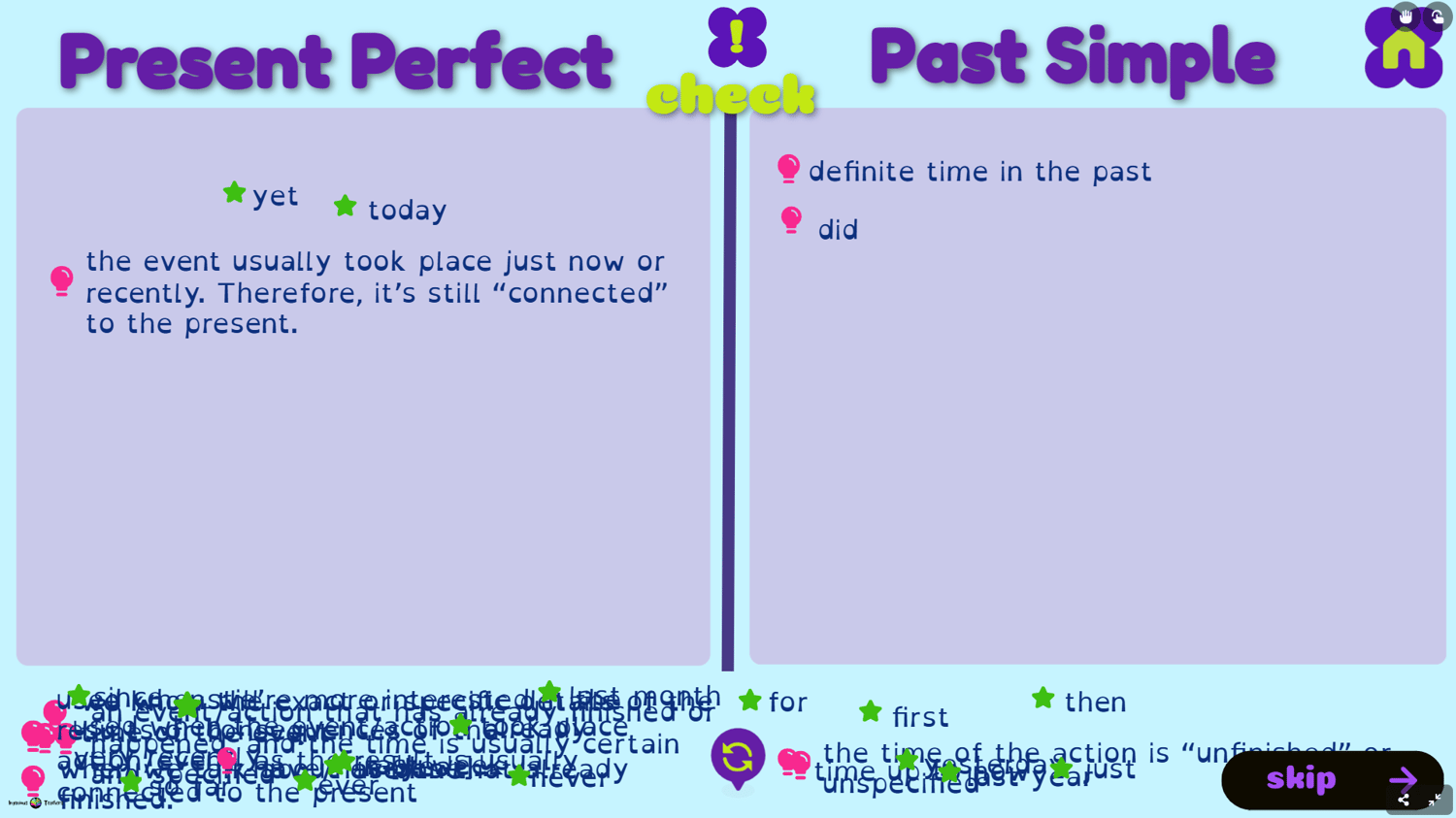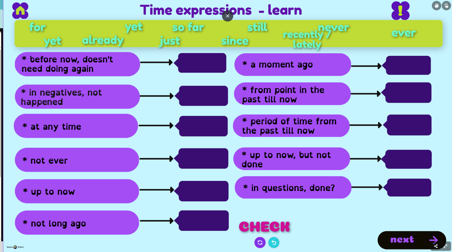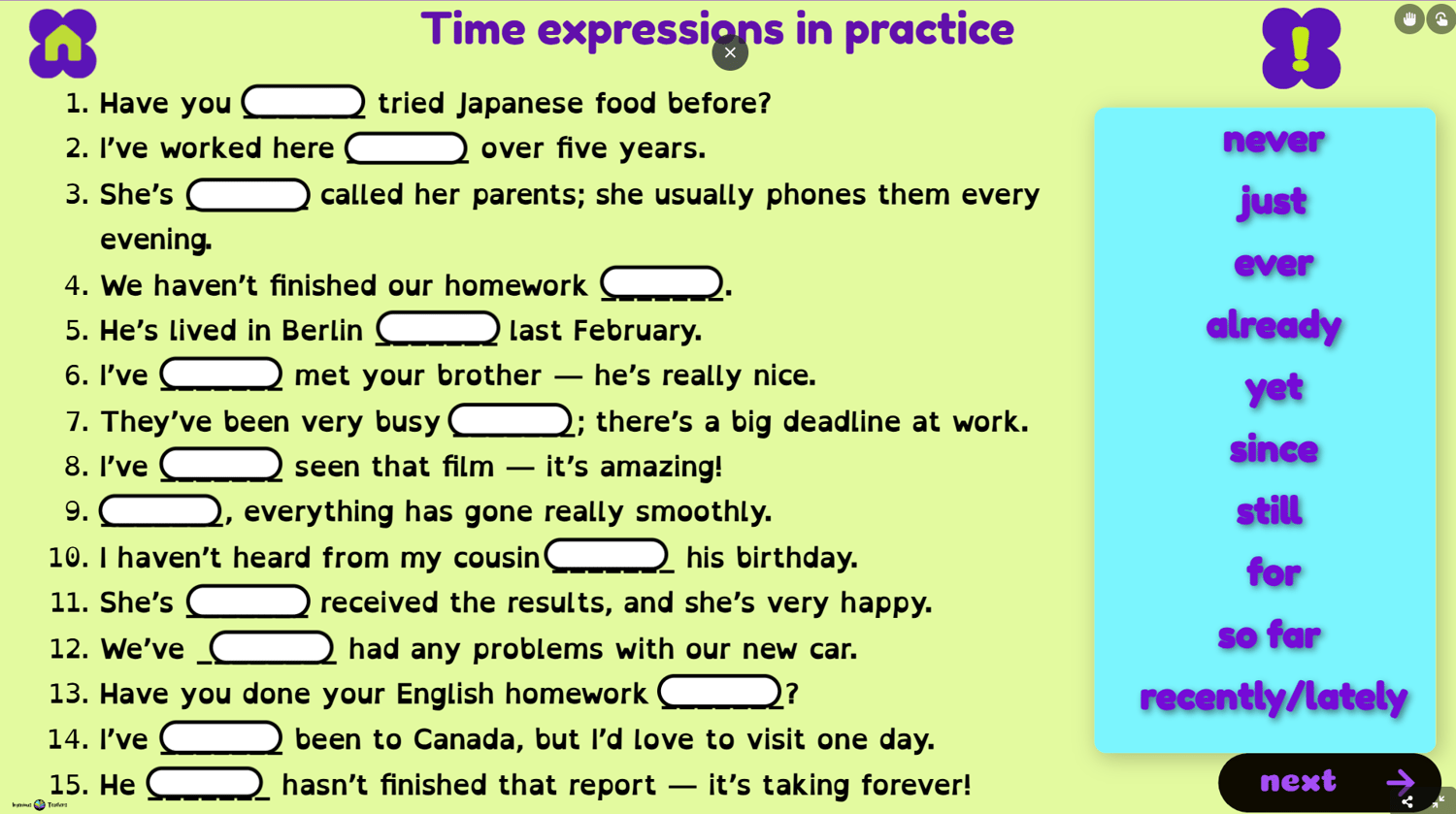 Teach grammar in context, discovering multiple activities to help your students understand the concept. Use our complementary resources for Present Perfect - let's practice and Present Perfect - time expressions to thoroughly introduce grammar.