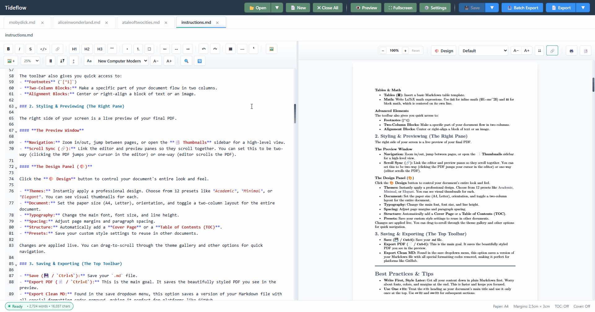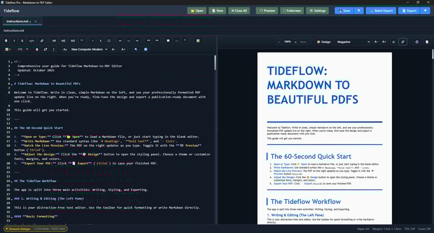 Tideflow is a fast, Markdown to PDF desktop app designed to help you focus on one thing: writing.