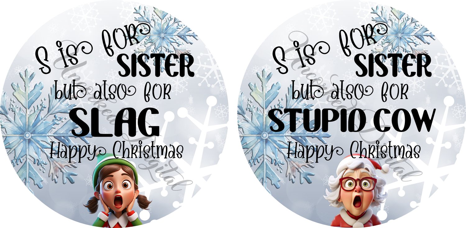 A selection of 11 funny Christmas designs for circular baubles, resizable so suitable for various sized blanks.