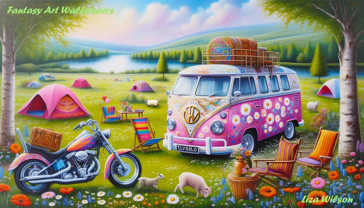 Hippie style pink campervan with white daises in a lush green field with a beautiful lake, trees & flowers, tents & little chairs. There is a Harley Davidson motorbike with painted art on the bodywork.