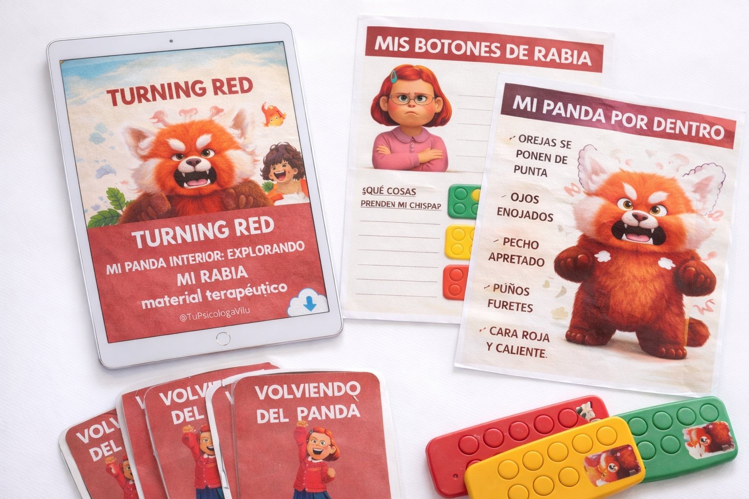 (Foto referencial: en Instagram @Tupsicologavilu en las historias desacatadas podrás encontrar en “recursos” todos los materiales) Este material terapéutico está diseñado para trabajar la rabia y la desregulación emocional en niños y niñas a través del juego, la metáfora y la externalización de la emoción. Inspirado en Turning Red, utiliza al panda como representación simbólica de la rabia, permitiendo que los niños la observen, la nombren y comprendan sin sentirse definidos por ella.