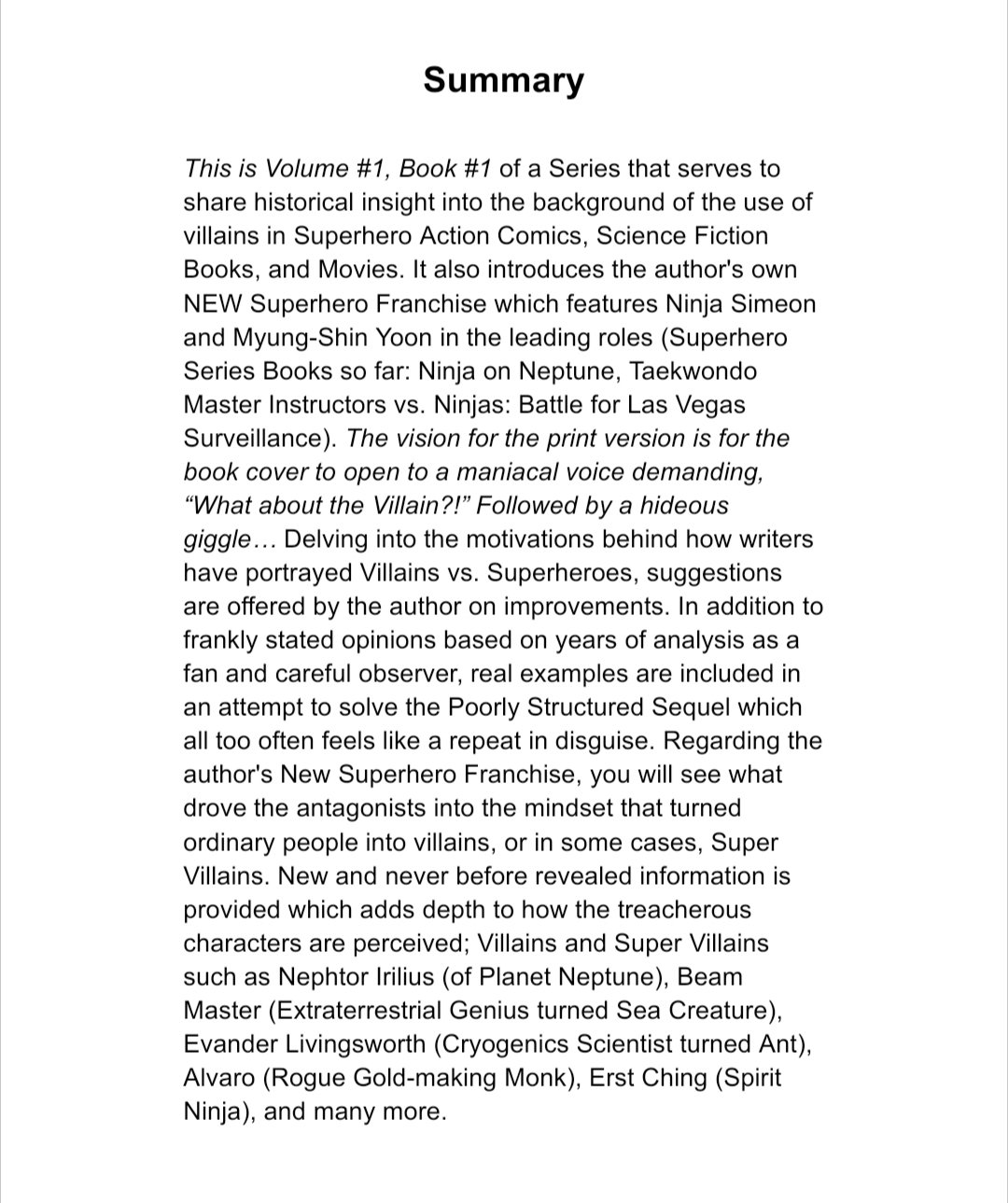 This is Volume #1, Book #1 of a Series that serves to share historical insight into the background of the use of villains in Superhero Action Comics, Science Fiction Books, and Movies. It also introduces the author's own NEW Superhero Franchise which features Ninja Simeon and Myung-Shin Yoon in the leading roles (Superhero Series Books so far: Ninja on Neptune, Taekwondo Master Instructors vs. Ninjas: Battle for Las Vegas Surveillance). The vision for the print version is for the book cover to open to a maniacal voice demanding, “What about the Villain?!” Followed by a hideous giggle… Delving into the motivations behind how writers have portrayed Villains vs. Superheroes, suggestions are offered by the author on improvements. In addition to frankly stated opinions based on years of analysis as a fan and careful observer, real examples are included in an attempt to solve the Poorly Structured Sequel which all too often feels like a repeat in disguise. Regarding the author's New Superhero Franchise, you will see what drove the antagonists into the mindset that turned ordinary people into villains, or in some cases, Super Villains. New and never before revealed information is provided which adds depth to how the treacherous characters are perceived; Villains and Super Villains such as Nephtor Irilius (of Planet Neptune), Beam Master (Extraterrestrial Genius turned Sea Creature), Evander Livingsworth (Cryogenics Scientist turned Ant), Alvaro (Rogue Gold-making Monk), Erst Ching (Spirit Ninja), and many more.