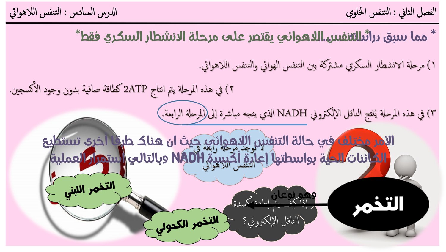 العرض يحتوي على شرح وتفاصيل عملية التنفس اللاهوائي بنوعية الكحولي واللبني للصف الثاني عشر