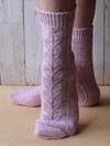 The stitch counts for the patterned panel are modified so that the cabled panels are the same width as the stocking stitch sole, this results in the socks fitting the same as a regular stocking stitch socks with a stitch count of 46 (54, 62, 70, 78, 86) sts.