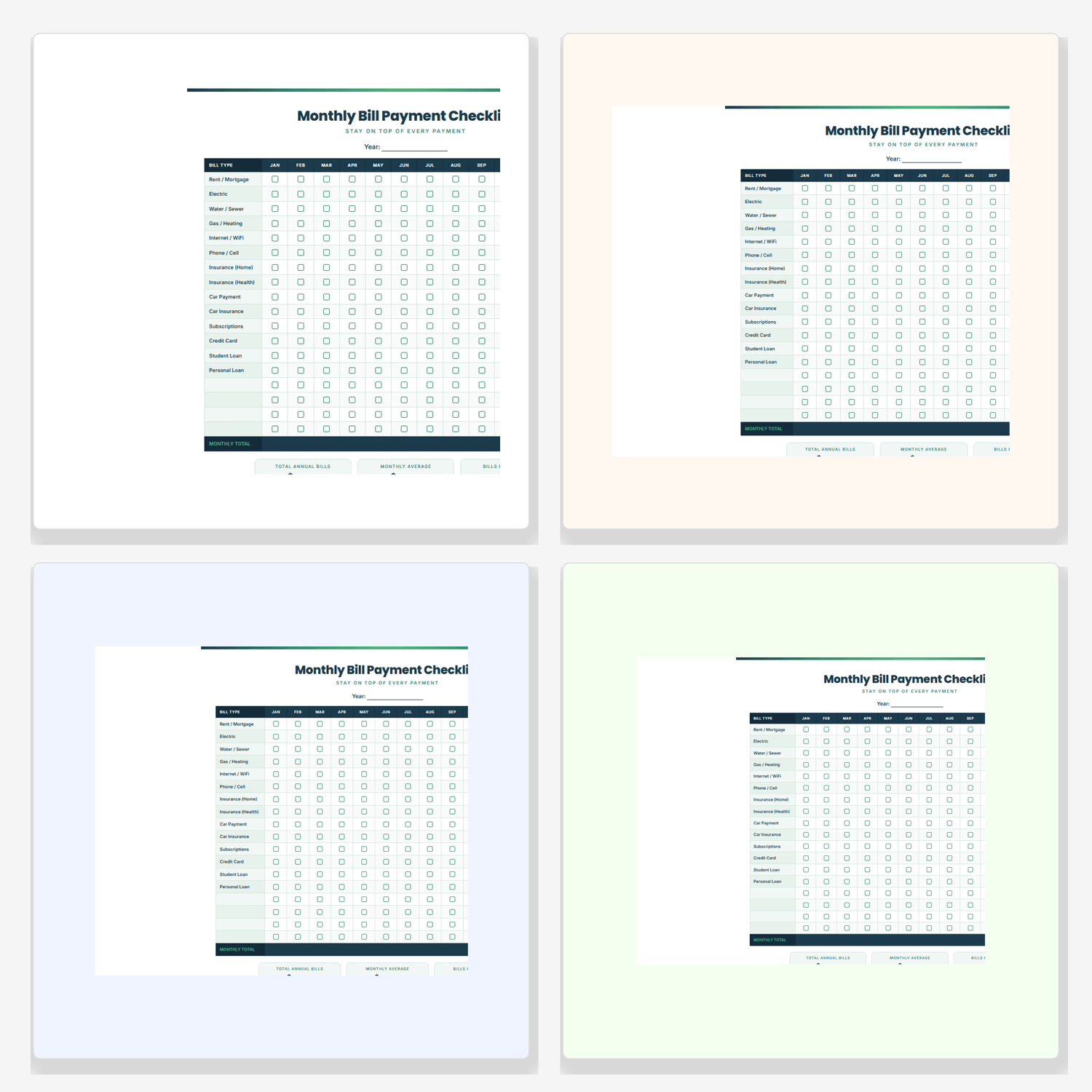 Never miss a bill again! Track all your monthly bills across 12 months with this clean checklist. Rows for Rent, Electric, Water, Gas, Internet, Phone, Insurance, Car, Subscriptions, Credit Card, Loans and more. Checkbox for each month. Totals row at bottom. Professional green/navy design. US Letter PDF.