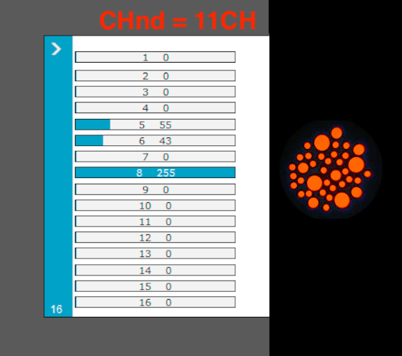 * Verifique que coincidan estos canales: 8 Dimmer, 5 en el valor 55 = Color Naranja, 6 en el valor 43 = Gobo de Burbujas (ver tercer foto).