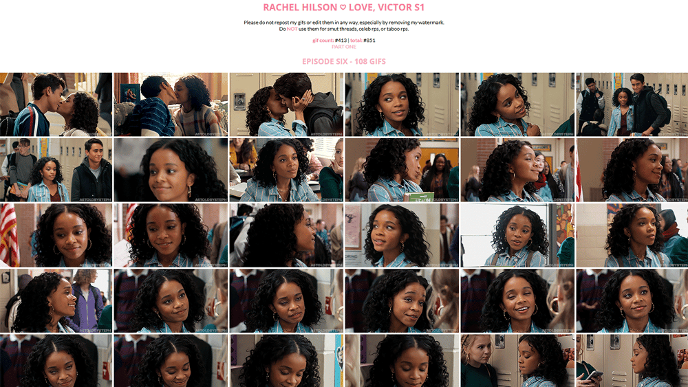 this download includes a .txt file linking to a page with #851 gifs of rachel hilson in season one of love, victor. all gifs are 268 x 150.