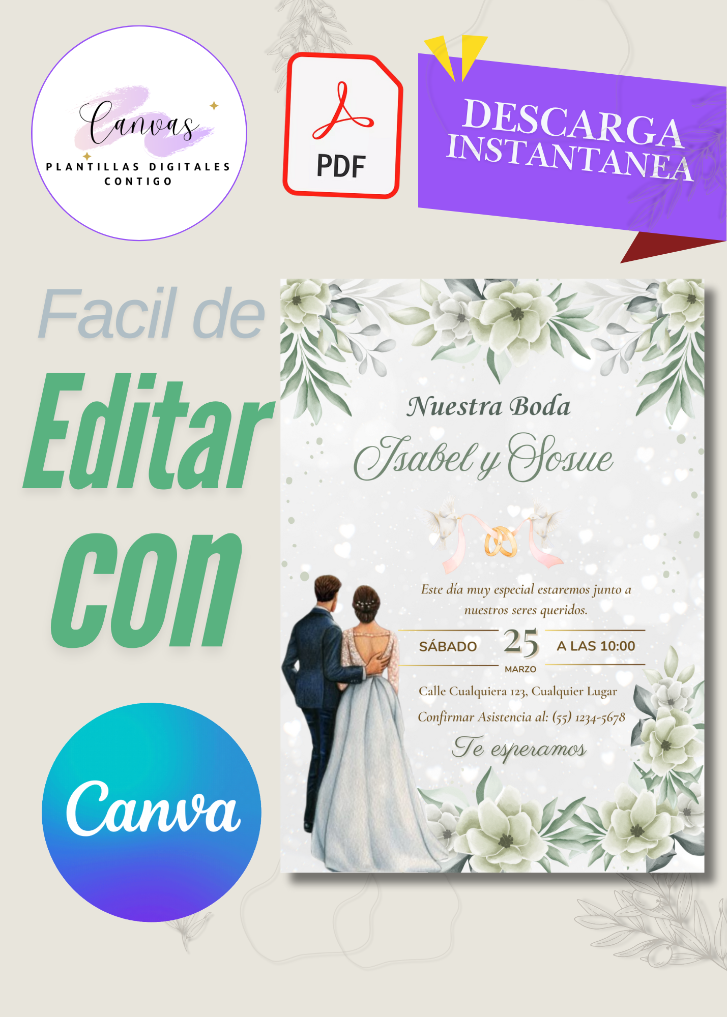 ✅ Fácil de personalizar: Cambia los textos con los detalles de tu evento (nombres, fechas, lugar, etc.).