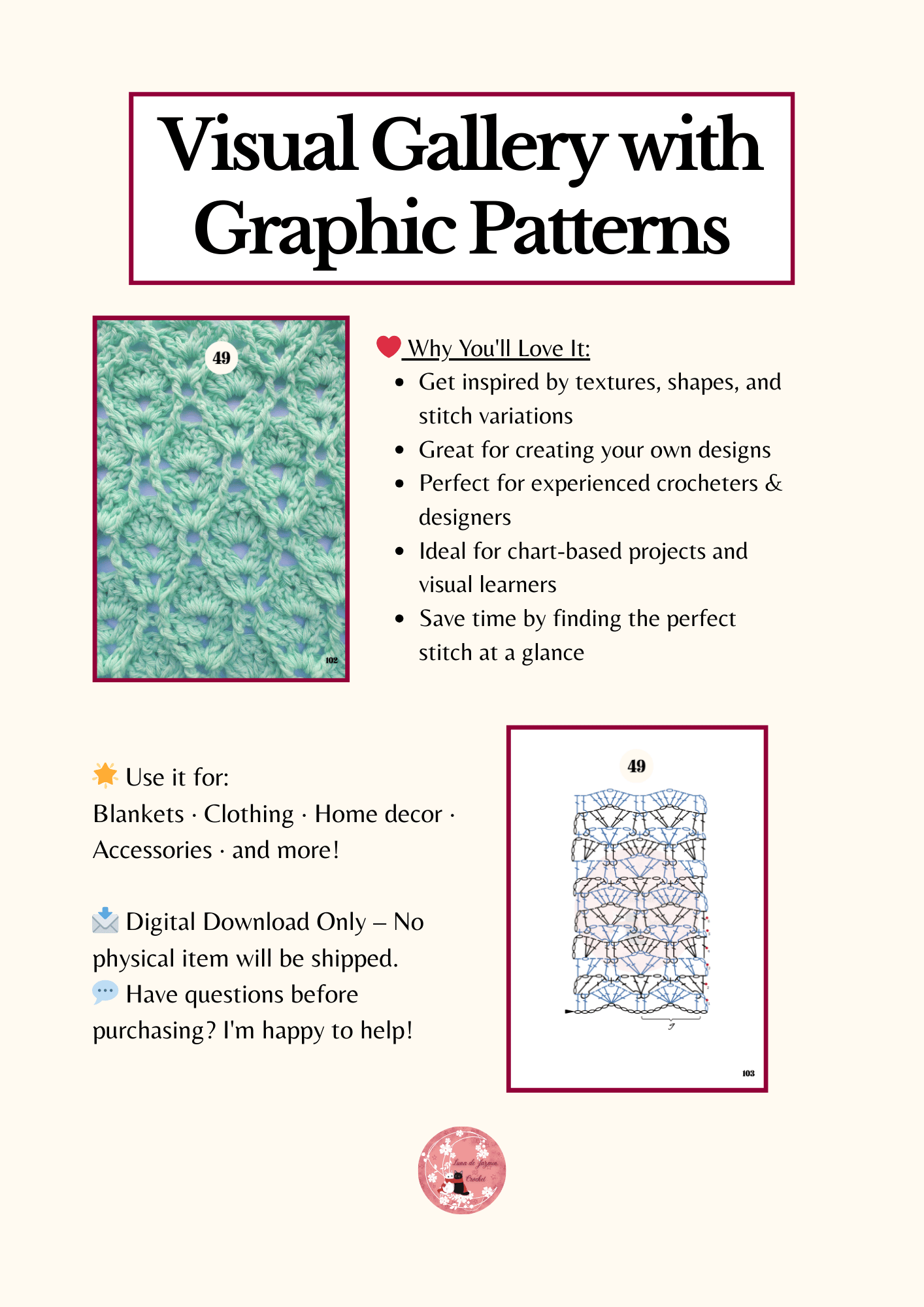 Are you just starting your crochet journey or looking to expand your stitch collection? This e-book is your ideal companion. With clear visuals, high-quality images, and detailed stitch charts, you’ll learn 50 of the most popular and decorative crochet stitches.