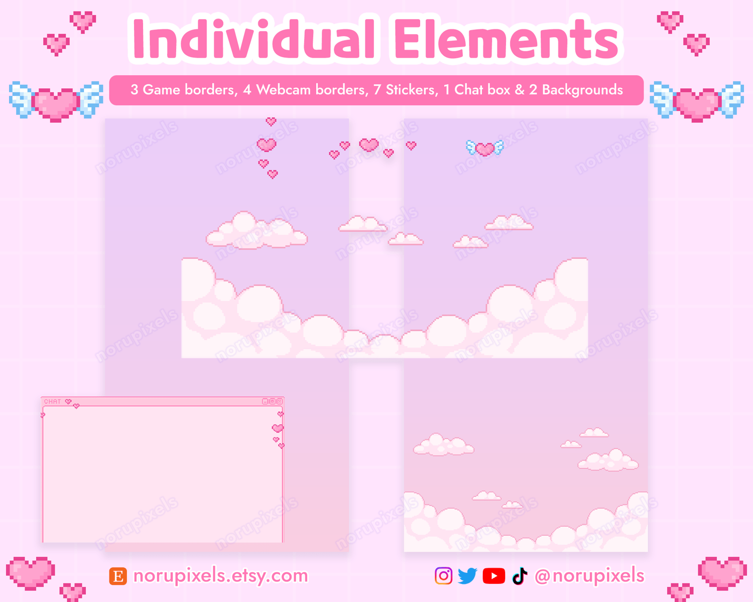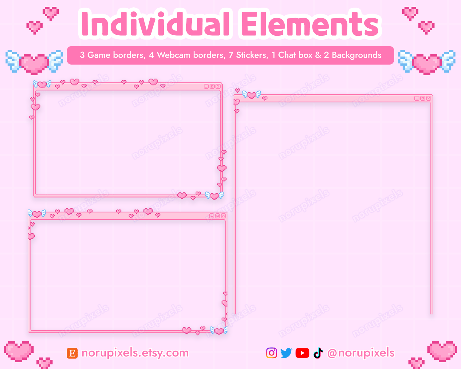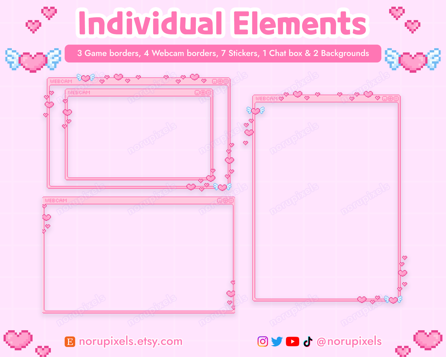 - Individual elements from overlay: 3 game borders, 4 webcam borders, 1 chat box, 7 stickers & 2 backgrounds (.PNG format)