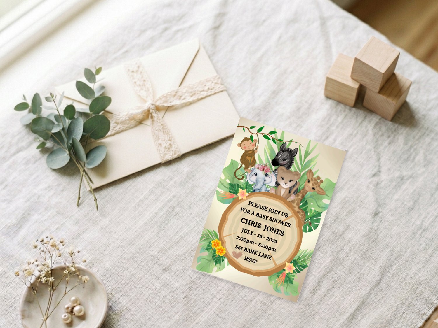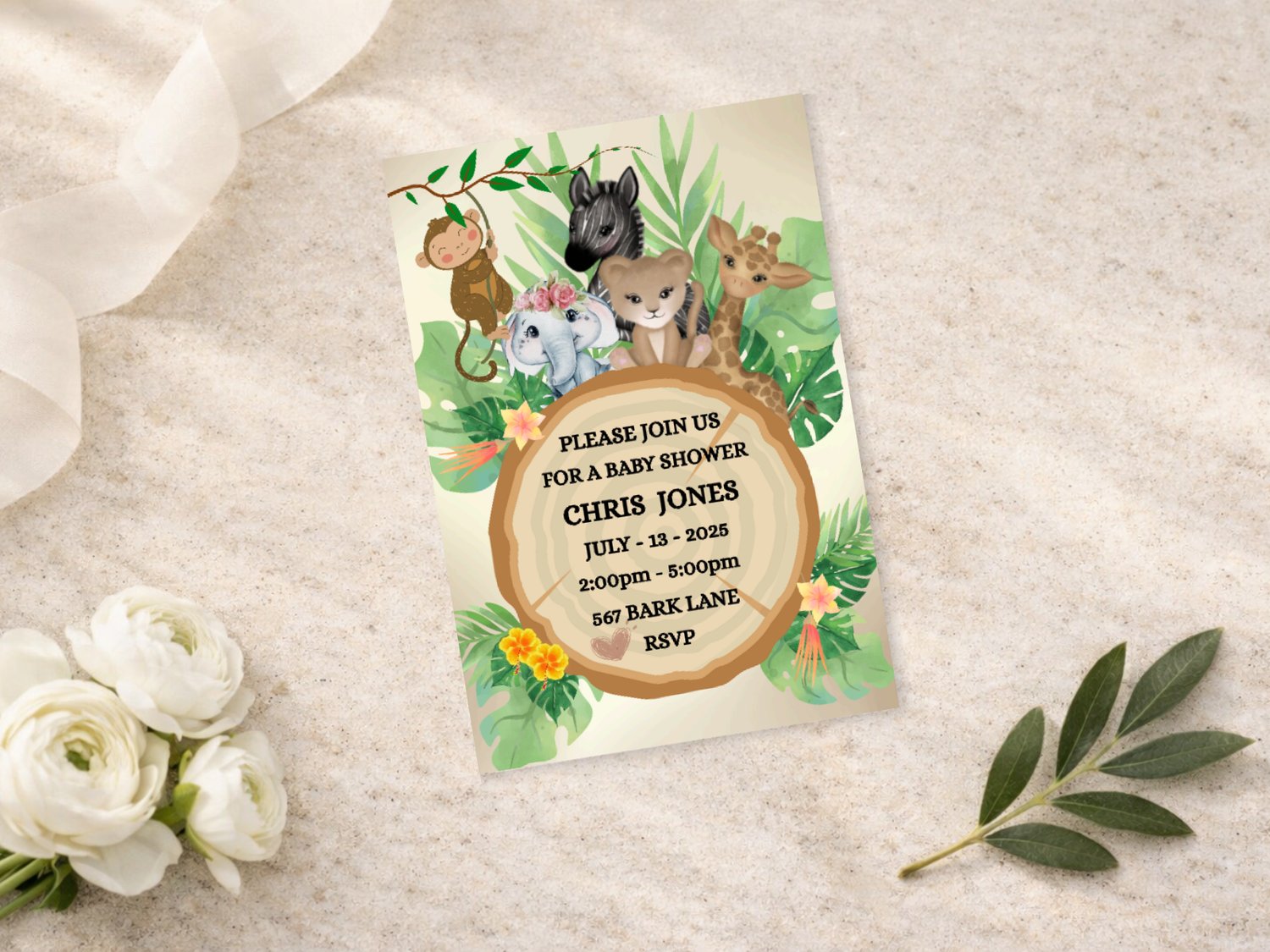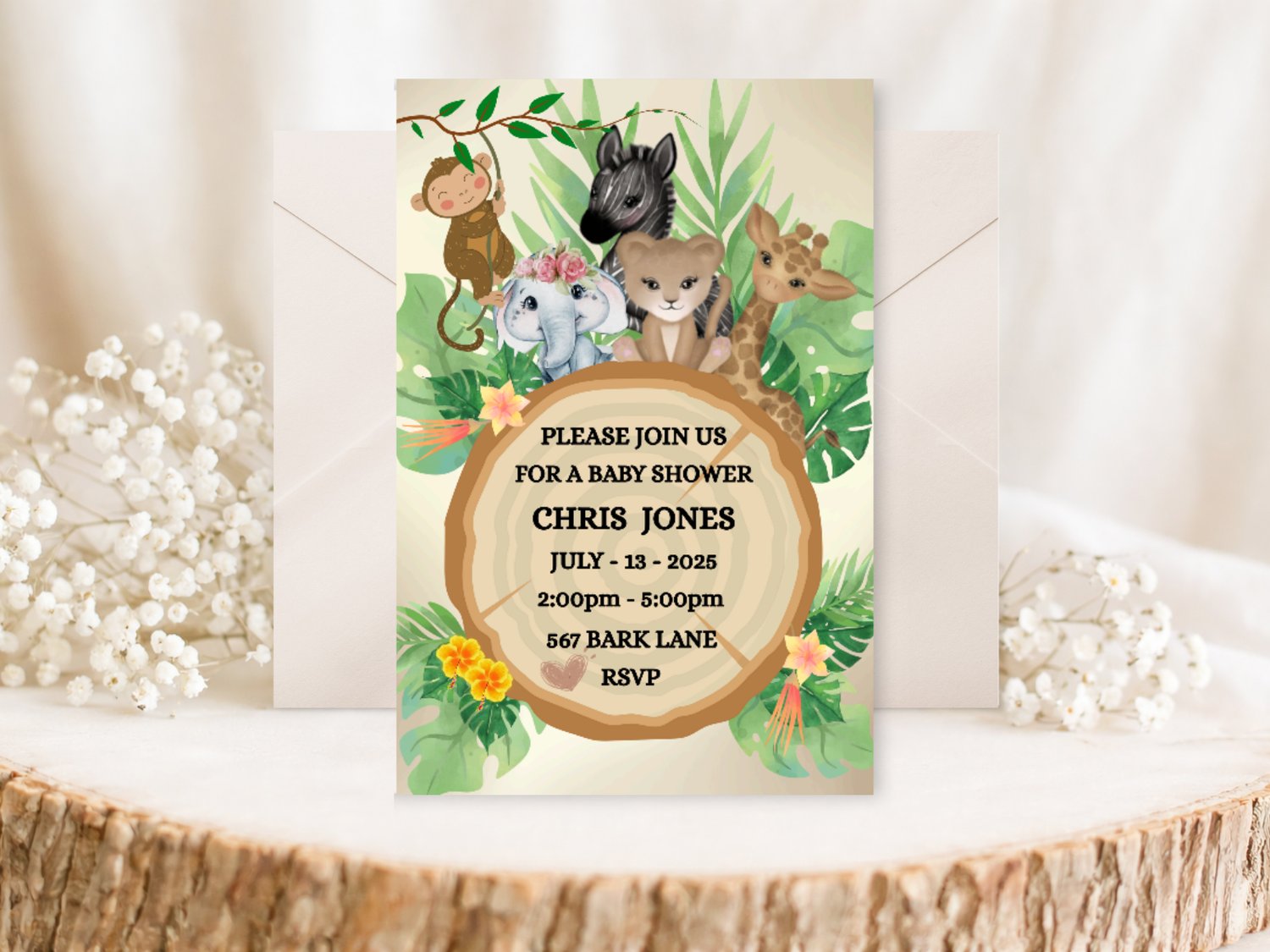 Celebrate a special day with this adorable jungle-themed baby shower invitation, perfect for a wild and fun celebration! Featuring sweet safari animals like a lion, giraffe, monkey, elephant, and zebra surrounded by lush greenery, this editable 5x7" invitation is ideal for both boys and girls.